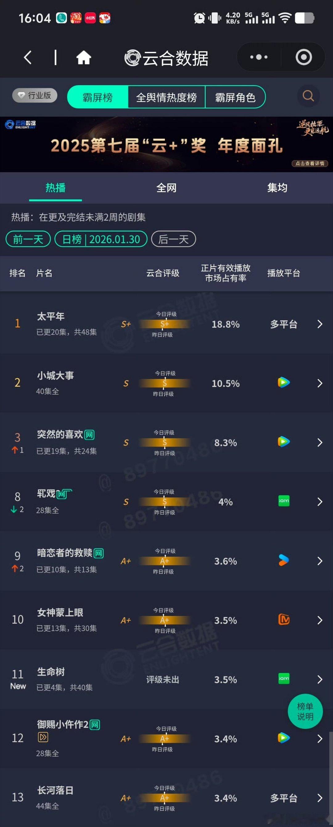 生命树首日云合占比3.5%,四集预估600万不到,集钧不到150万酷云首日两集平