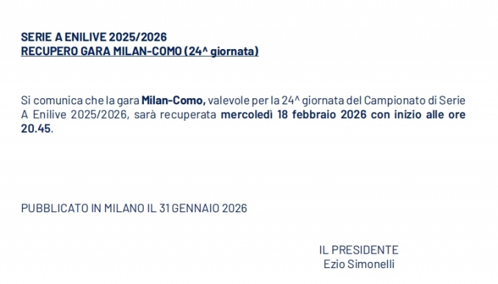 意甲官方:AC米兰主场对阵科莫的补赛将在2月19日03:45进行