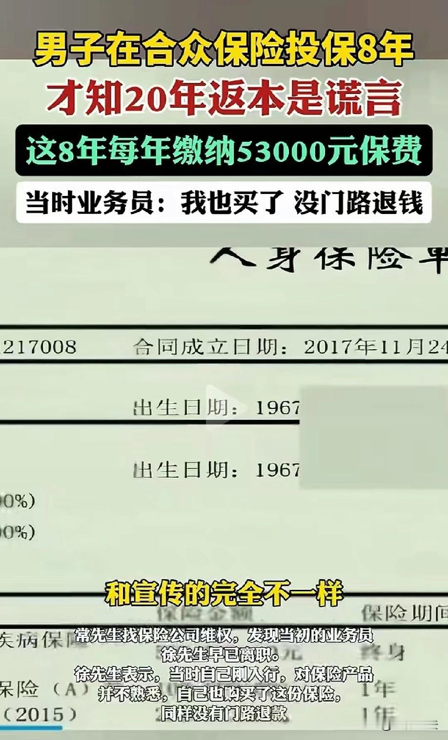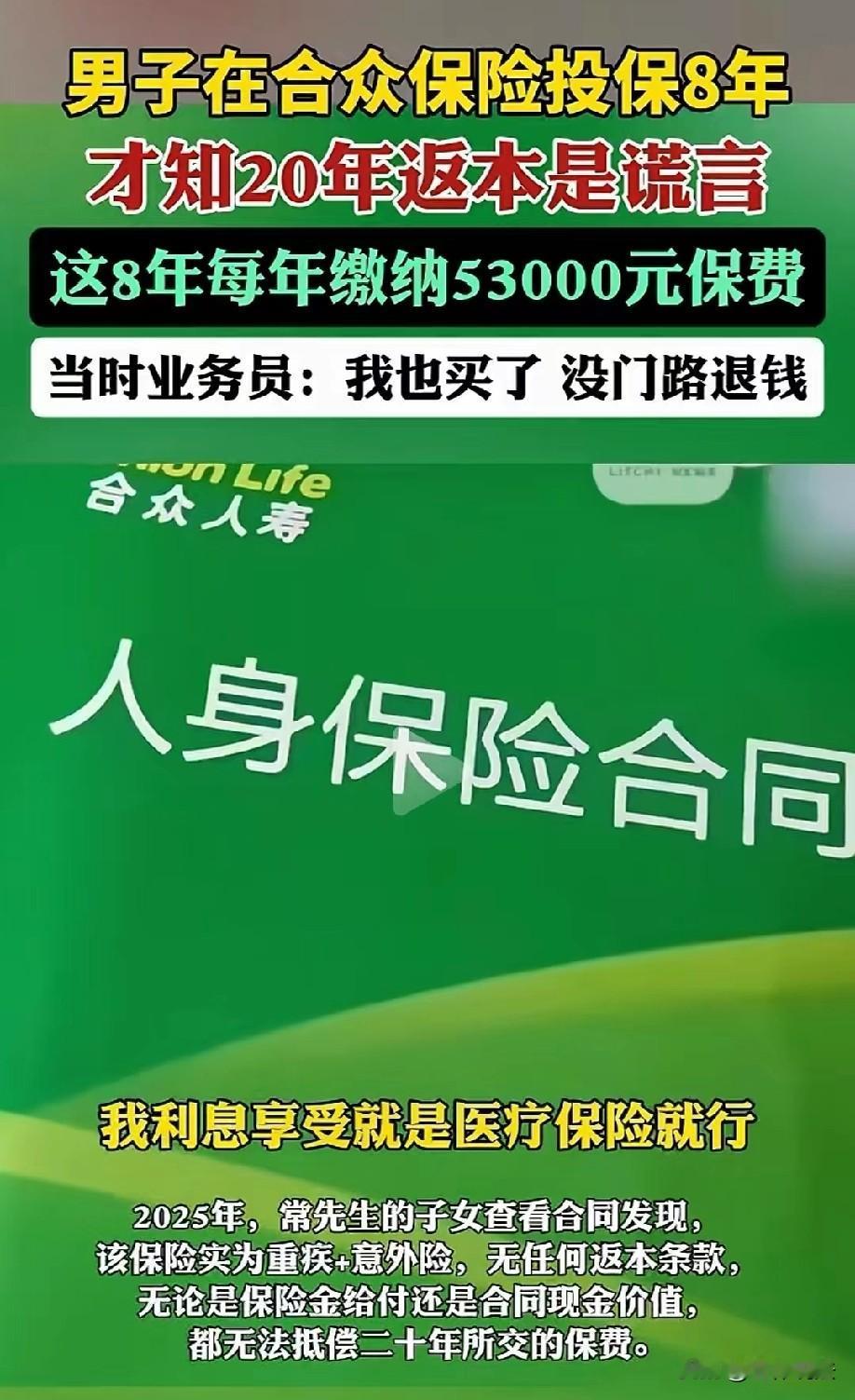 江苏盐城,男子在保险公司上班的朋友推荐下,购买了两份“不错”的保险产品,每年缴纳53000元的保费。连续缴了八年后,男子的子女突然翻看合同发现,所谓的20年返本根本就是个谎言,这份保险压根就不退还本金。男子慌了,赶紧找到当年的朋友,希望能给他退还这些年的本金,利息就不要了,没想到,朋友的解释让他非常无语。 男子常先生为人豪爽,对身边的朋友也是非常信任。 2017年,当时在保险公司上班的朋友徐先生夫妇找到常先生,热情地给他推荐了一款合众保险的保险产品,还一个劲儿地说这保险“不错”。 徐先生夫妇拍着胸脯保证,买这份保险,20年后就能返还本金,利息收益也非常可观。 常先生一听,觉得既然是朋友推荐的,那肯定挺靠谱,也没多想,就买了两份。 从那之后,常先生就像完成一项重要任务一样,连续八年,每年都雷打不动地缴纳53000元的保费。 他心里想着,等20年后本金拿回来,也算是给家里存了一笔钱,心里还挺踏实。 时间一晃就到了2025年。有一天,常先生的子女闲来无事,就翻出了保险合同仔细查看。 这一看可不得了,子女惊讶地发现,这保险根本就不是当初朋友说的那样。 合同上写得明明白白,这是一款重疾加意外险,压根就没有返本的条款。不管是保险金给付,还是合同现金价值,都远远抵不上这20年要交的保费。 常先生得知这个消息后,脑袋瞬间空白,整个人都慌了神,这可咋办啊,这么多年的钱不就打水漂了? 常先生赶紧联系当年的朋友徐先生:老徐啊,我子女看了合同,这保险根本不返本,是这样的吗?要真的不能返本,你能不能帮我把这些年的本金退回来,利息我不要了。 他满心期待着朋友能给他一个满意的答复。 可没想到,徐先生的解释让他特别无语。徐先生无奈地解释:我当时刚入行不久,对这保险产品也不熟悉。我自己也买了这份保险,现在也没门路退款,我也是受害者。 常先生听了这话,心里实在无奈,却只能干瞪眼。 没办法,常先生只好自己找保险公司维权。可当他联系保险公司时,保险公司告知他,当初的业务员徐先生早已离职了。 保险公司的言外之意就是人走责任消,这事和他们无关,有问题请找徐先生。 常先生没办法,只能求助记者。 记者陪同常先生找到了合众人寿的销售服务部。工作人员表示,常先生的诉求需要向上级反映,他们做不了主。 截止到目前,常先生还是没有收到任何回复。 如今,常先生愁眉苦脸地告诉记者:我只希望能把本金退给我,利息我都不要了。这产品和当时宣传的完全不一样,就算我活到105岁,这本金还是一分钱都拿不到。 常先生因轻信朋友,八年缴纳超42万保费,却发现保险并无返本条款,导致维权陷入困境。 因此,购买保险切勿仅凭人情和口头承诺,务必仔细研读合同条款,核实保障内容与收益规则。 朋友推荐并非靠谱保障,专业条款才是核心依据,只有擦亮双眼、理性投保,才能避免落入消费陷阱,守护自身财产安全。