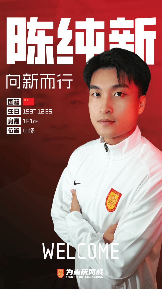 重庆铜梁龙正稳步构建新赛季的参赛阵容,全力备战中超赛场的全新挑战。陈纯新的加盟,将进一步充实球队的阵容厚度,为球队的战术布局提供更多可能。欢迎陈纯新加入重庆铜梁龙大家庭,期待他快速融入球队、适应战术体系,充分发挥自身特点与优势,与全体将士并肩作战、凝心聚力,以拼搏之姿为重庆而战,携手为重庆足球的荣耀全力以赴,在新赛季的赛场上共创佳绩!