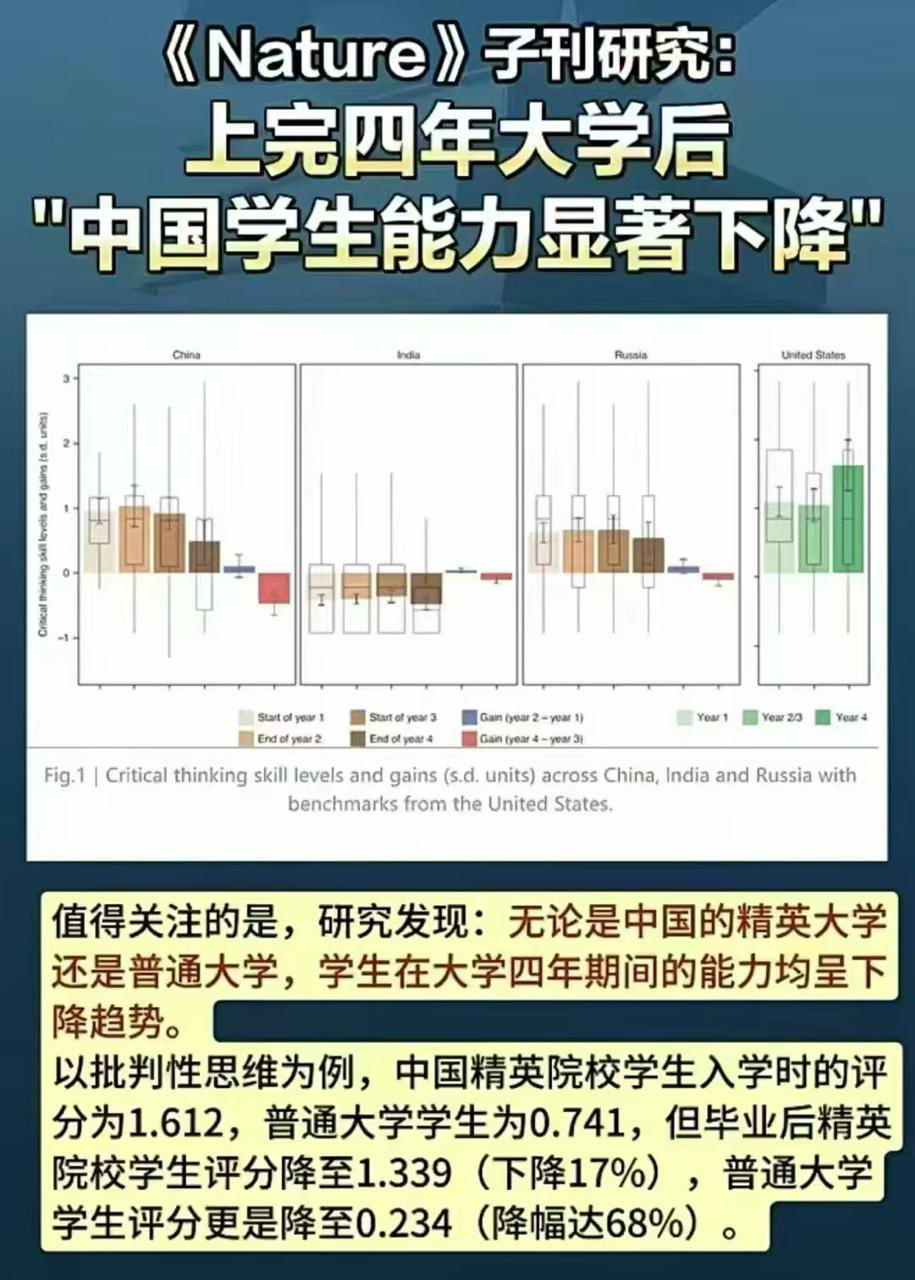 发表在《Nature Human Behaviour》(《自然 - 人类行为》,《Nature》子刊)上的一项跨国研究结果,核心结论是中国大学生在四年大学后,批判性思维等核心能力出现了显著下降。这项研究由斯坦福大学、美国教育考试服务中心(ETS)、北京大学、清华大学等机构合作完成,追踪了中国、印度、俄罗斯、美国四国共 3 万多名计算机科学与电气工程专业的学生,从大一入学到大四毕业的完整四年能力变化。~~~~~~~~大学读的,居然倒退了