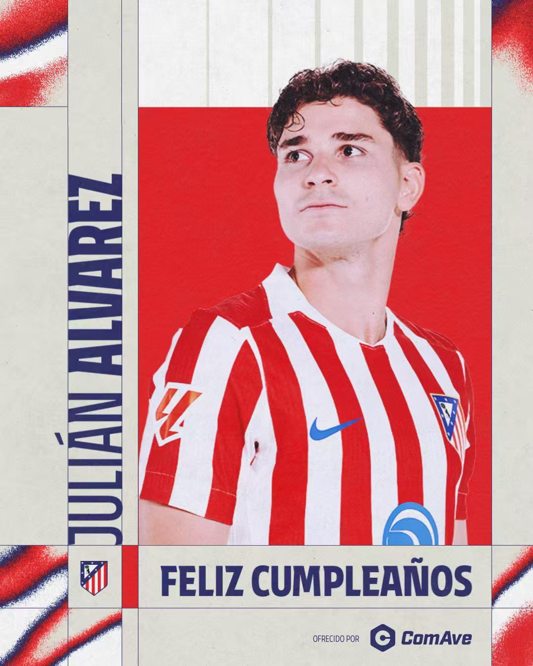 虎扑01月31日讯马德里竞技俱乐部通过官方社交媒体发布了一张特制海报,为球队前锋阿尔瓦雷斯送上生日祝福并配文:“¡Felizcumpleaños,Julián!”(阿尔瓦雷斯,生日快乐!)