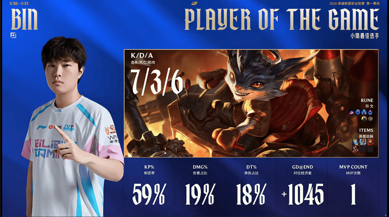 Bin兰博打出7/3/6战绩,斩获BLG对阵IG第一局MVP