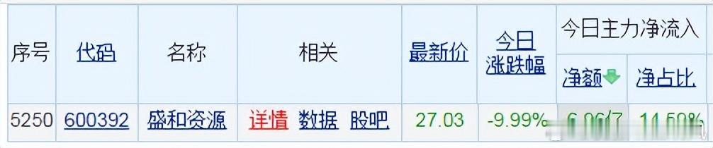 收盘价:27.03 元。涨跌幅:-9.99%。净流入: -6.96亿