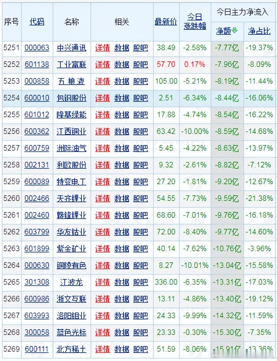 收盘价: 2.51元。涨跌幅: -6.34%。净流入: -8.44亿
