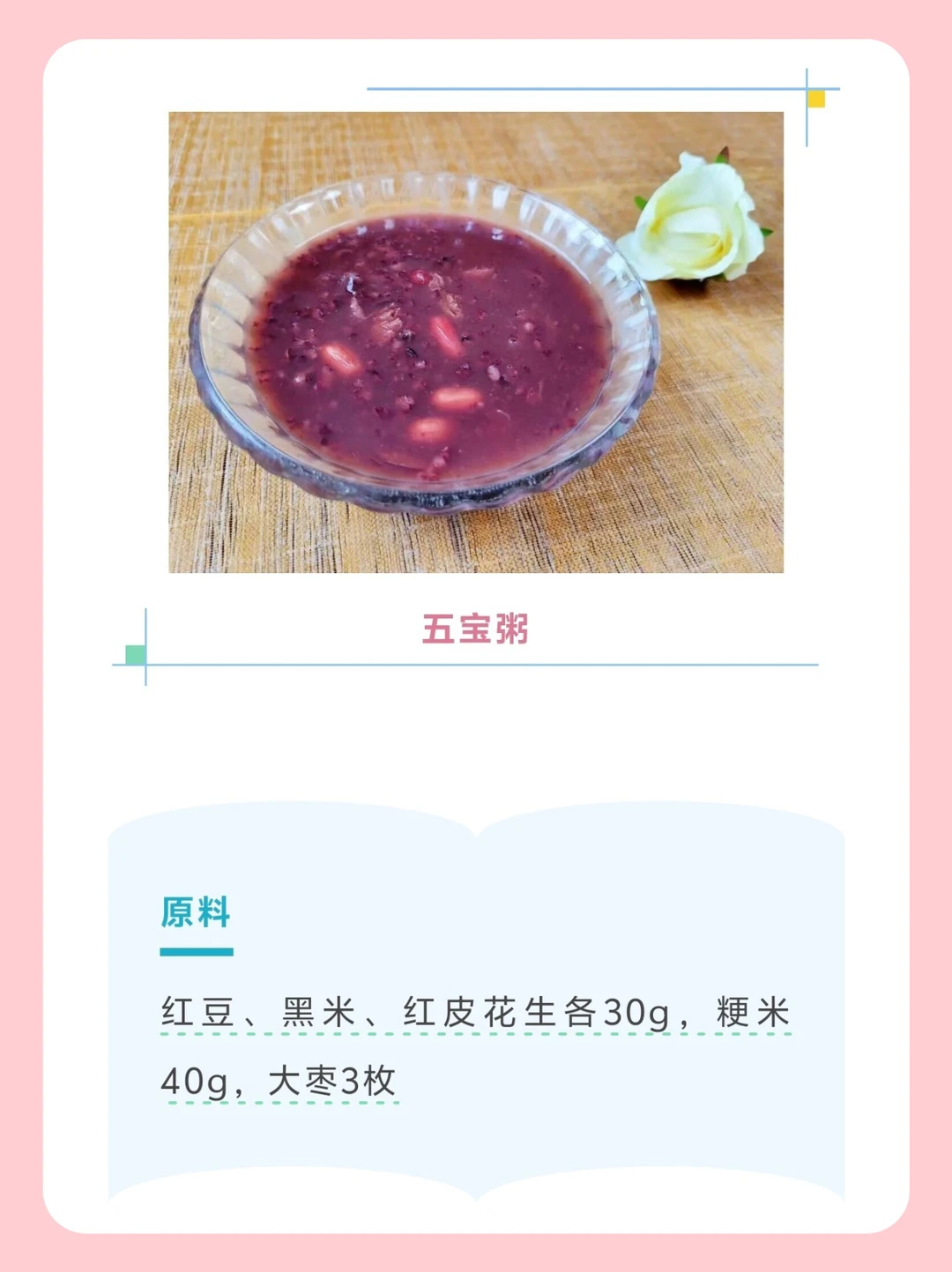 [清单R]原料:红豆、黑米、红衣花生各30g,粳米40g,大枣3枚。