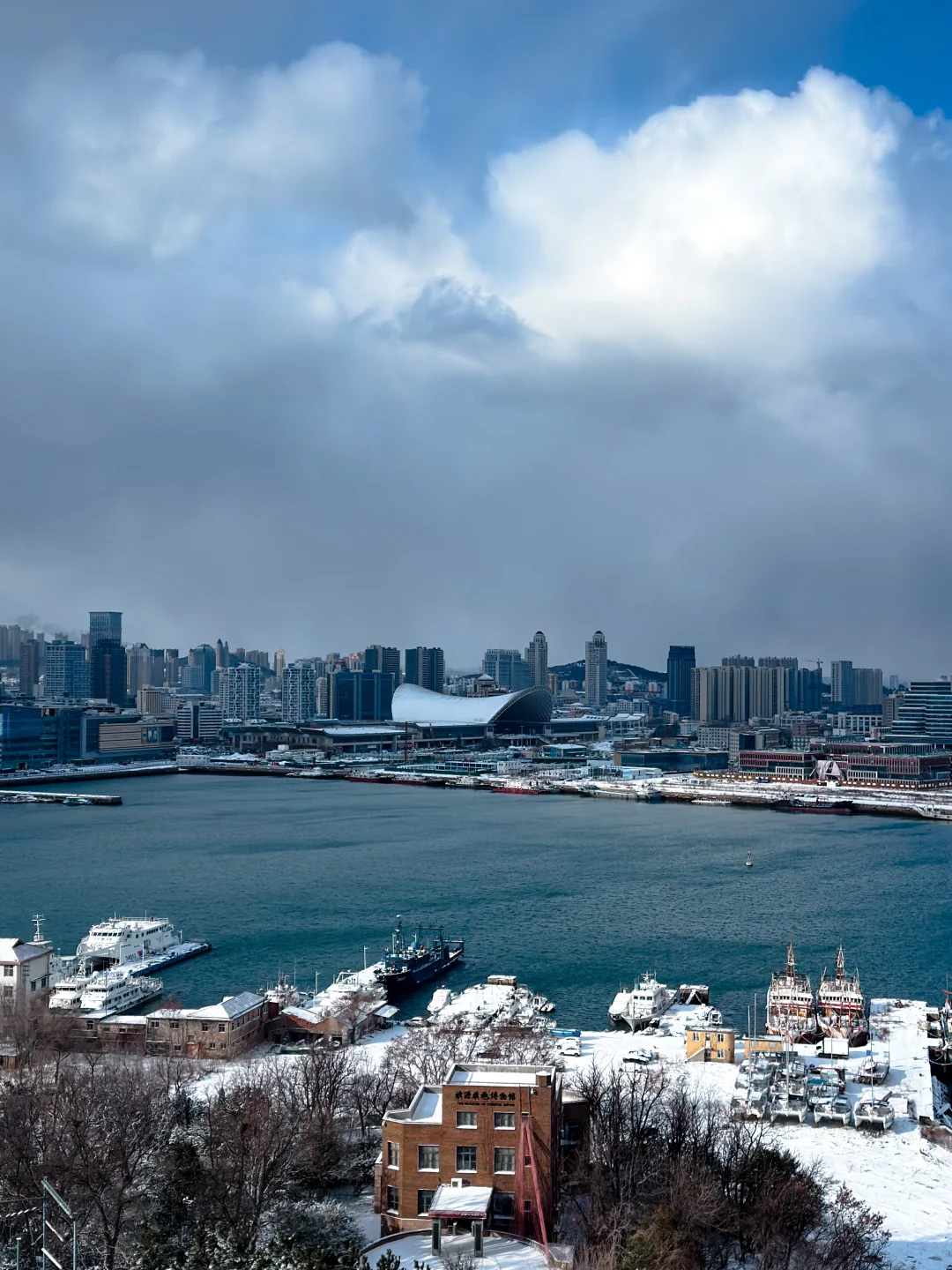 终于轮到俺打卡烟台站。 以前每次刷到烟台站都是风啊雨啊雪啊,这次终于轮到自己亲自打卡烟台站,风和雪都见识到了,但夜景还是第一次看到~~还会发光! 😂稍微有点震撼,超大穹顶灯光秀。 📷图3从烟台山远眺烟台站。 [加一R]好像也没网友说的那么‘离谱’,毕竟不是每天都有雨雪,虽然我当天的确赶上了大雪还有风。 白天天晴的时候看应该挺酷,出站旁边一个大悦城,怕冷的还能去买个毛衣,吃喝啥都挺方便。
