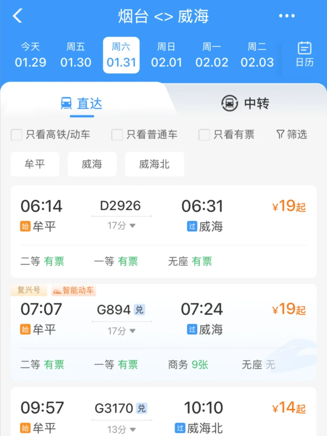试了好几个关键词,都没有找到烟台主城直达威海的火车,最近的车站是牟平-威海北。 雪窝子兄弟城居然没有直达火车。 看地图牟平距离养马岛很近,中间又会路过渔人码头。这里有一个很顺路的路线就是:朝阳街-烟台山-沿海公交车-渔人码头-养马岛-打车-牟平站-威海,大家觉得呢?