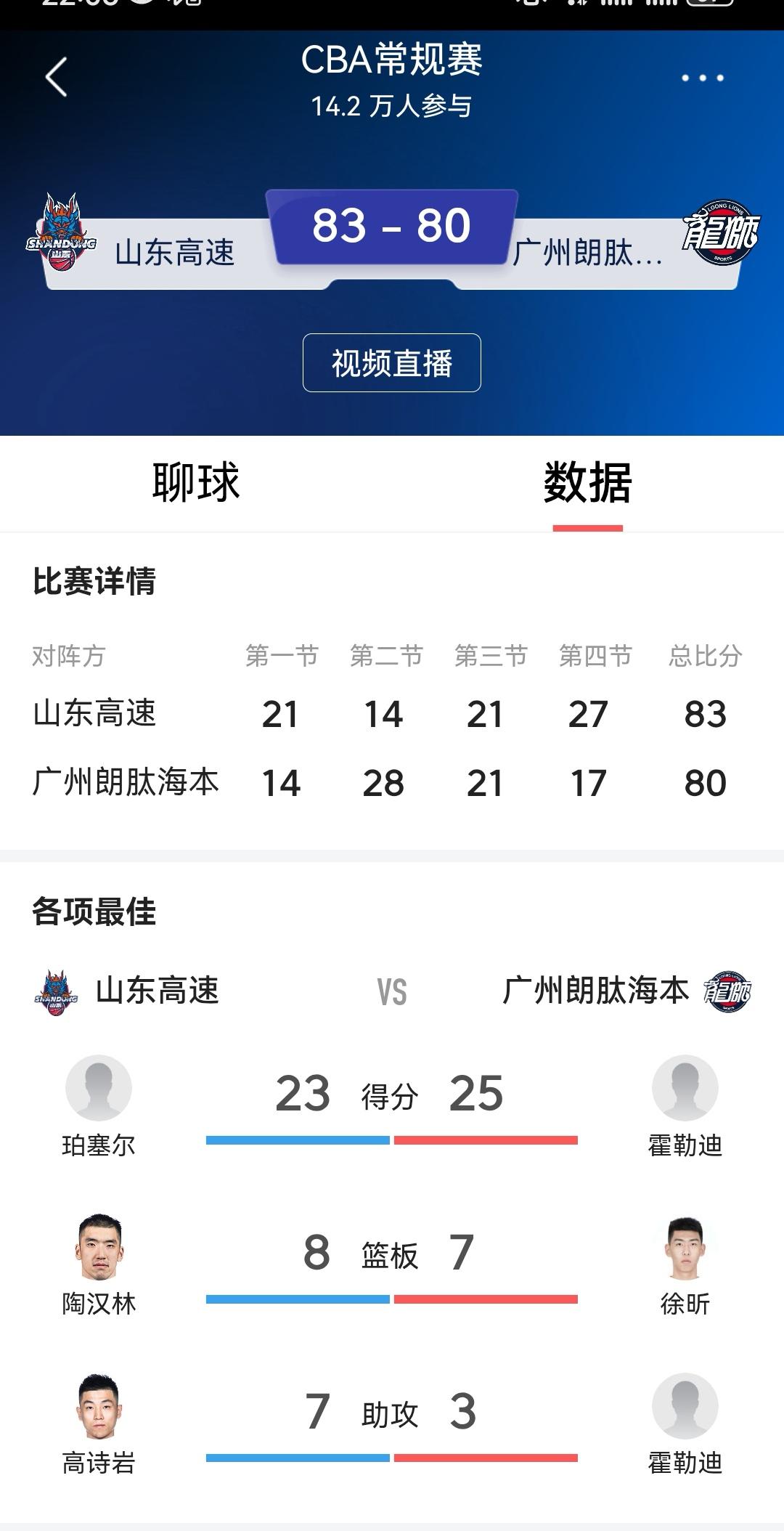 高诗岩14分7次助攻,山东男篮逆转广州,1月31日,CBA常规赛继续进行,山东高速男篮主场对阵广州男篮。最终山东队完成逆转,以83-80击败广州队,最后广州队的那个三分球太吓人了,然后广州男篮想造山东队的失误,结果时间也没有了。本场比赛,陶汉林最佳,尤其罚球稳如泰山。 山东高速男篮83-80战胜广州。 常规赛就是不断试错的,只有常规赛磨合好了季后赛轮转起来才不会一轮游,目前排名常规赛第4,现在名次不是太重要,只要每一场把想要的东西打出来,拼防守拼精气神。让更多的人轮转起来的同时选好季后赛的框架才是最重要的。本场比赛,山东高速队阵容更为齐整,高诗岩和鲍威尔复出。得分情况:珀塞尔23分、克里斯17分、陶汉林16分8篮板、高诗岩14分7次助攻、谢智杰6分、鲍威尔7分。 于德豪这个后卫打了18场,13场0分,还能场场有稳定的出场时间,陈林坚一点战术都没有甚至说高队长都不给他传球。虽然赢了,但是还有问题。为什么不给陈林坚传球?只是把他作为防守悍将?他的投篮呢?高诗岩都不给他传,一味的相信外援。这也就是主场,下场还这么打,那就输了!!陈林坚得利用啊!!为什么都不给陈林坚传球,一个三分射手一次出手都没有,难道都觉得自己比他投的准吗?!关于小将王证,上轮比赛觉得那个突破上篮确实看得出技术很好。三个三分也有运气的成分,邱彪赛后的采访说的很中肯,小将需尽快适应比赛节奏。