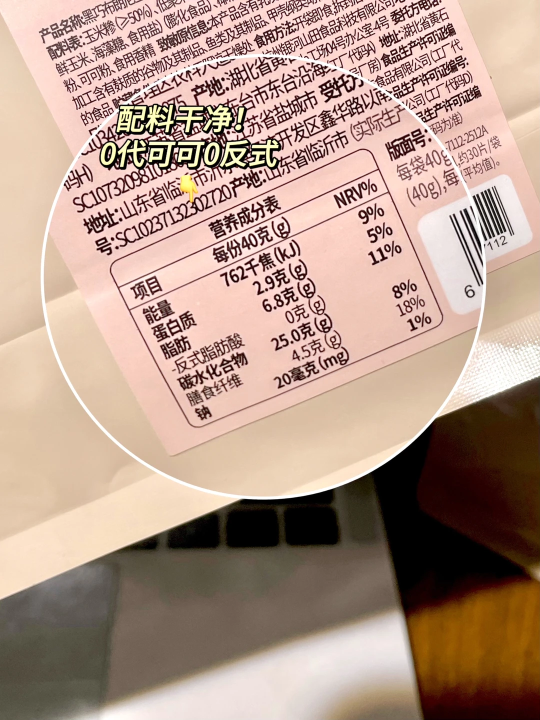 配料很干净,是非油炸的,0代可可脂,0反式脂肪,一片热量才6大卡,管理期也能放心吃!!