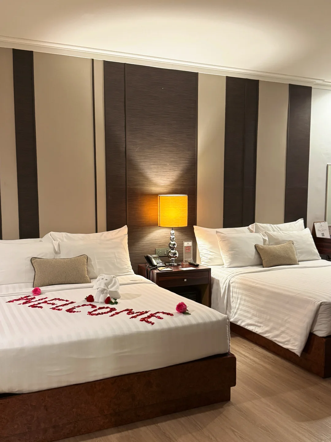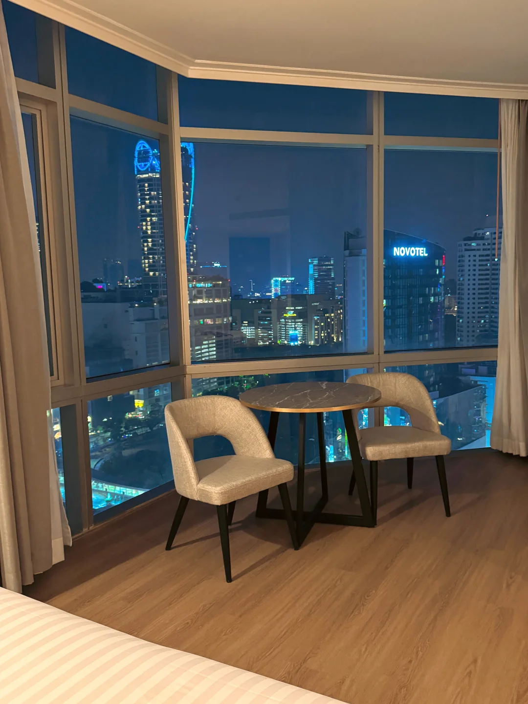 超大落地窗俯瞰曼谷市景,傍晚能看到像素大厦的灯光渐亮,夜景氛围感拉满🌃 房间超宽敞,床品柔软到倒头就睡,浴室带浴缸+浴袍,洗漱用品香味高级,细节控狂喜~