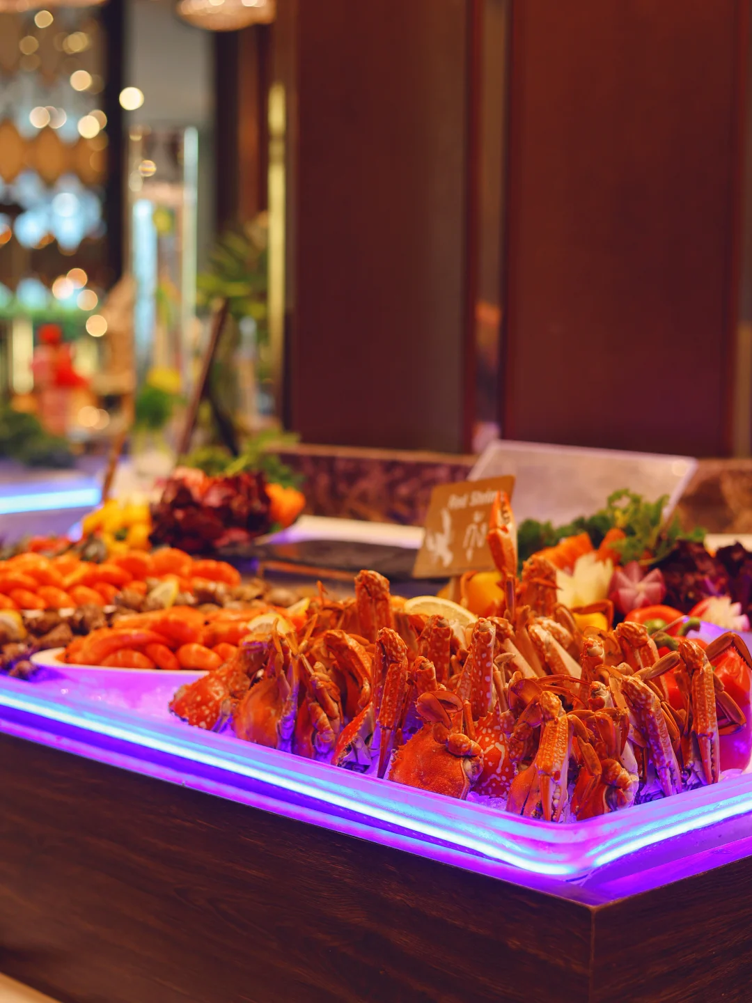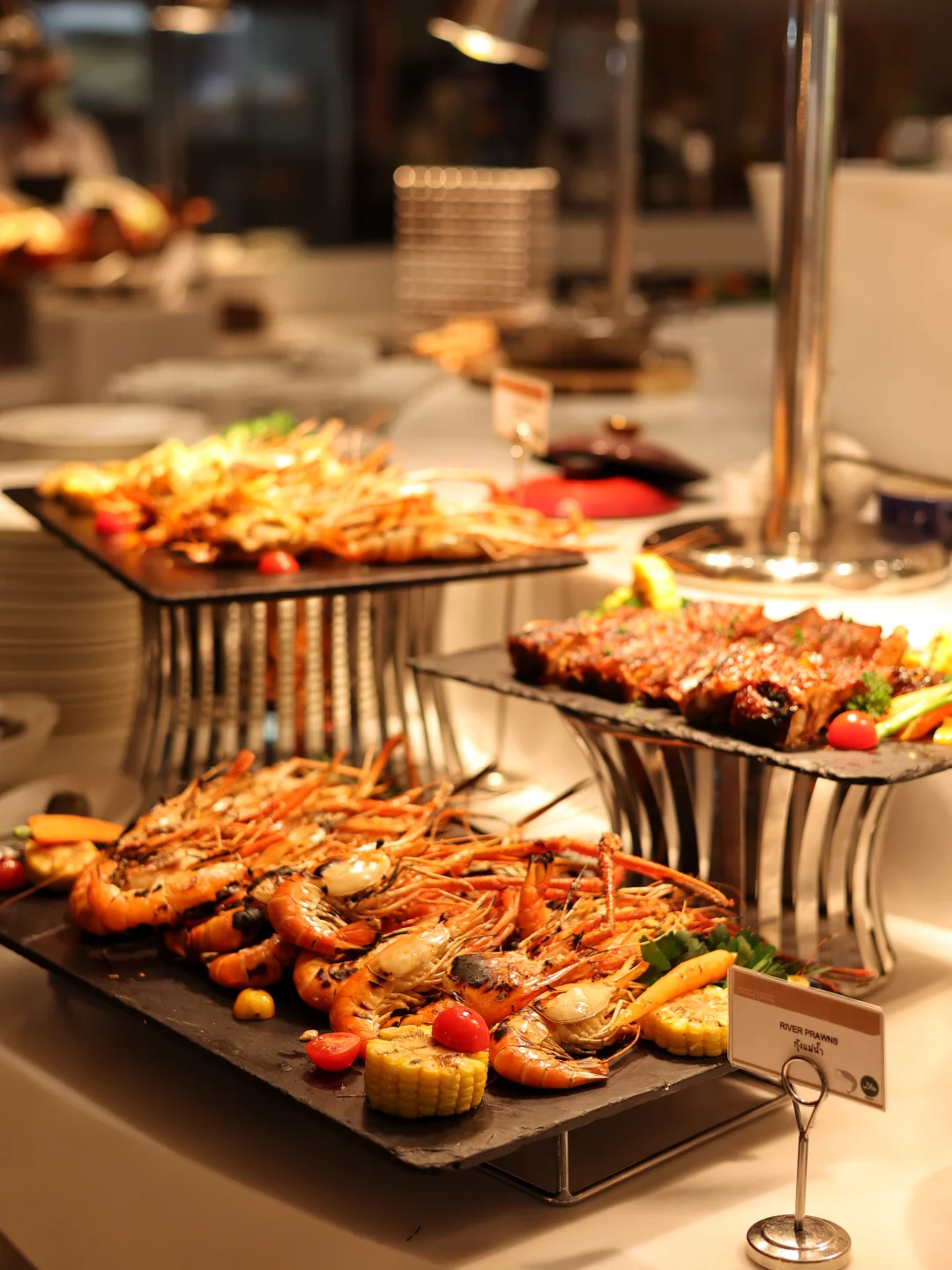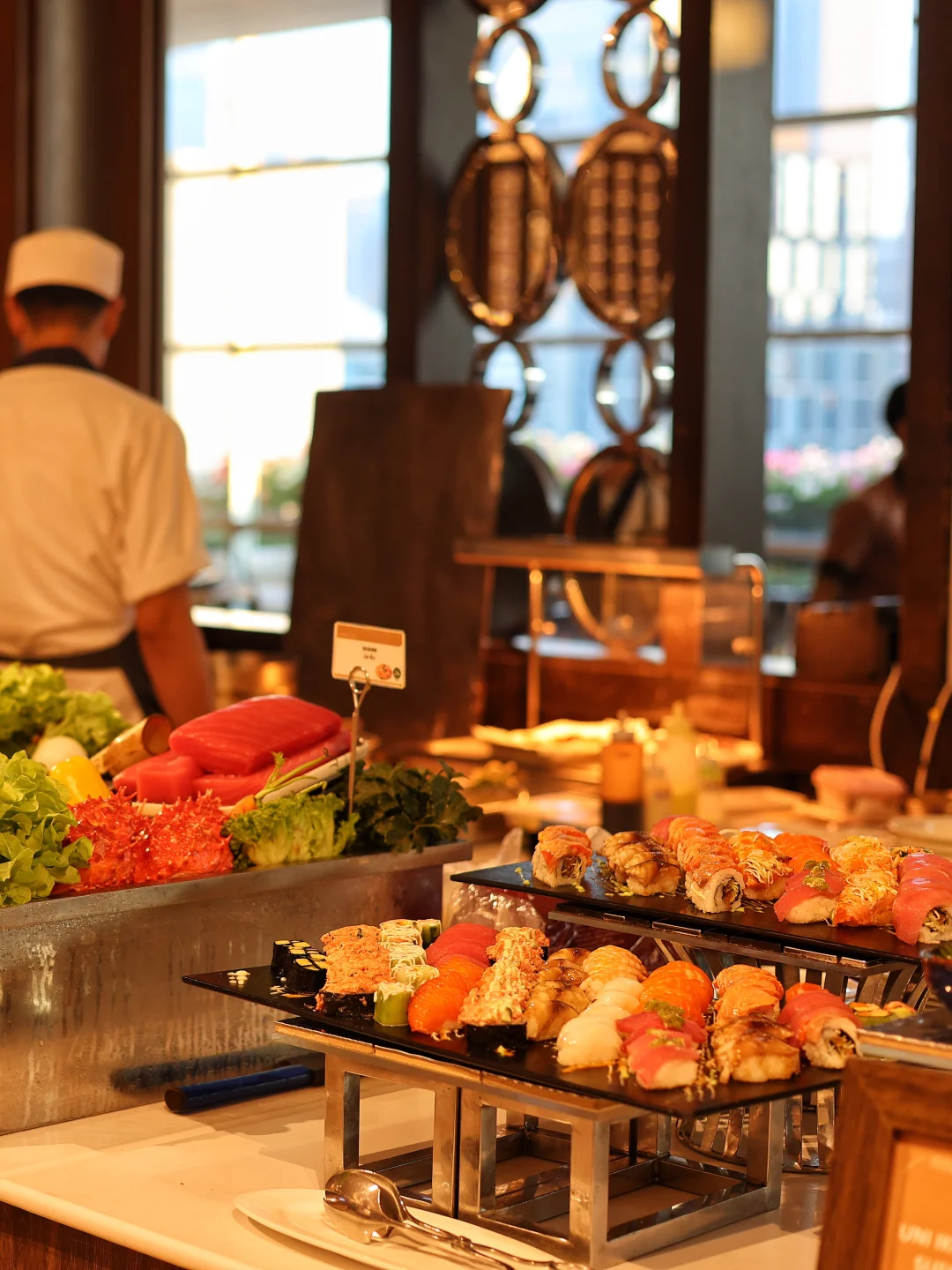 6点到10点的自助早餐,中西泰印风味全覆盖!现做蛋卷、泰式炒河粉、日式刺身、欧式甜品,连素食和清真餐都有~ 4岁以下宝宝免费,亲子家庭超划算,吃饱喝足直接开启暴走模式🥳