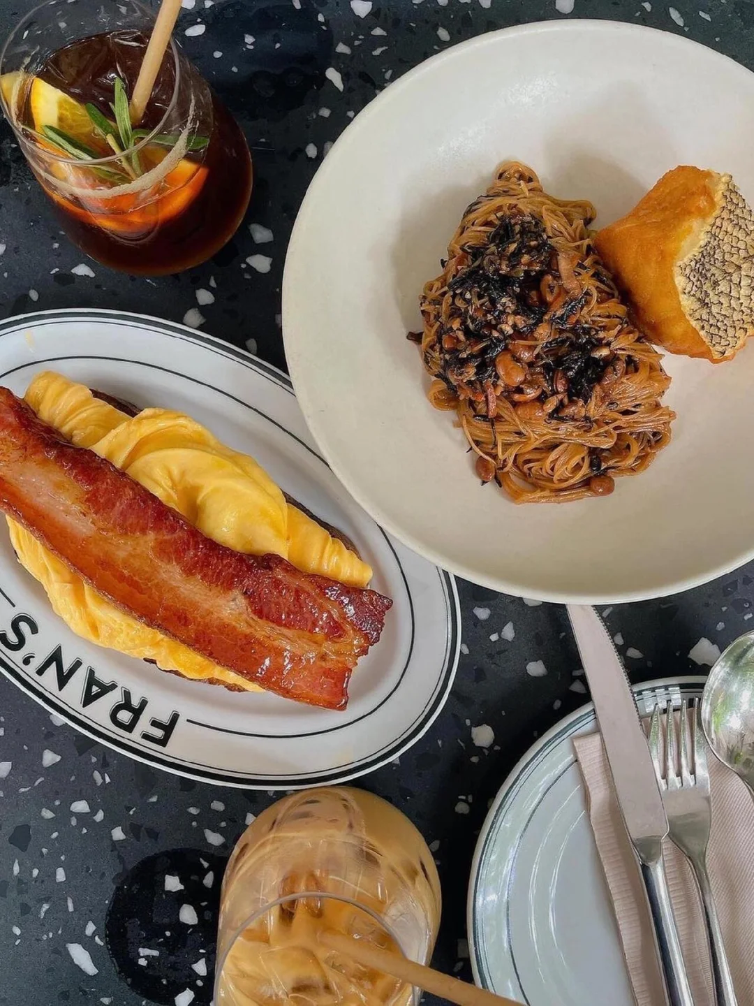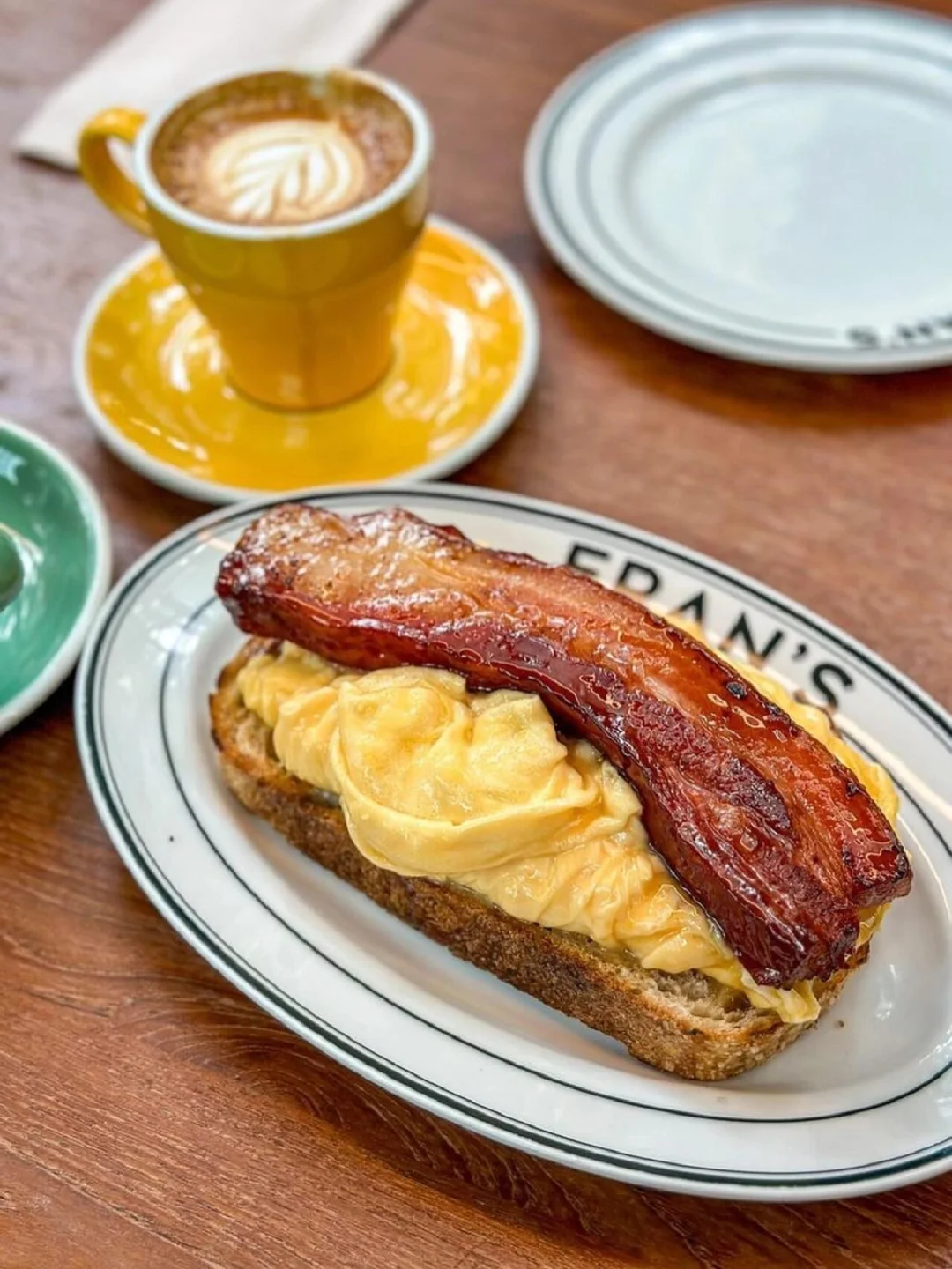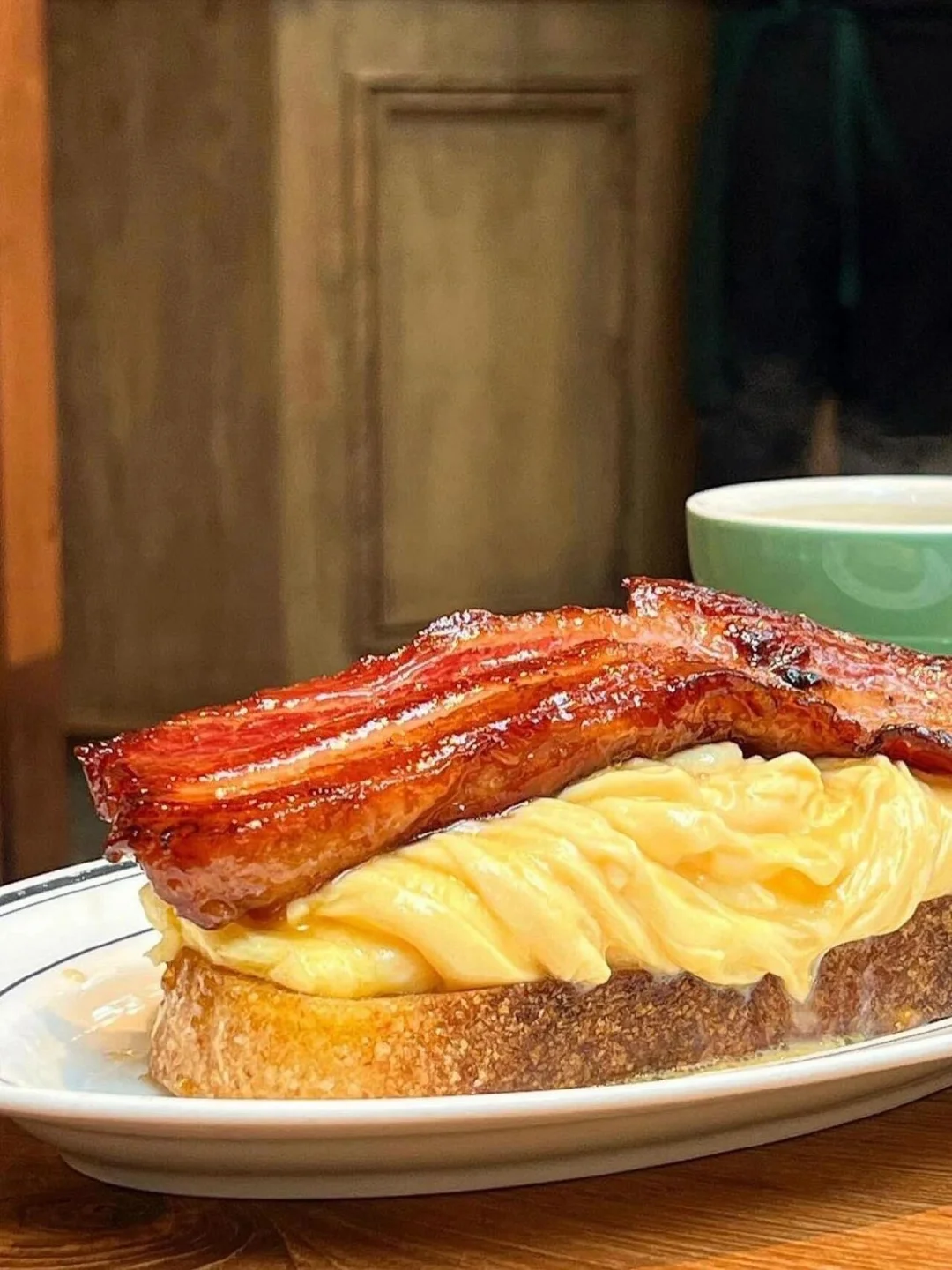 -天鹅绒鸡蛋和培根:多少人都是为了这一口而来,酥软的面包上铺着柔软的鸡蛋,最后是焦香的大块培根,这一口下去超满足超幸福