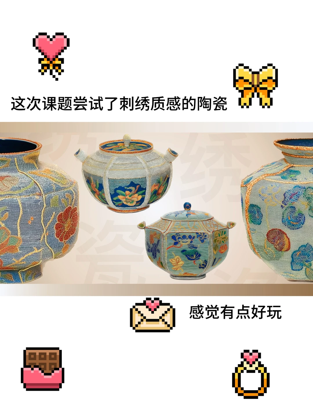 ·新的课题做了陶瓷器型和刺绣片片材质结合尝试,还感觉挺好看的,以后可以深入研究一下