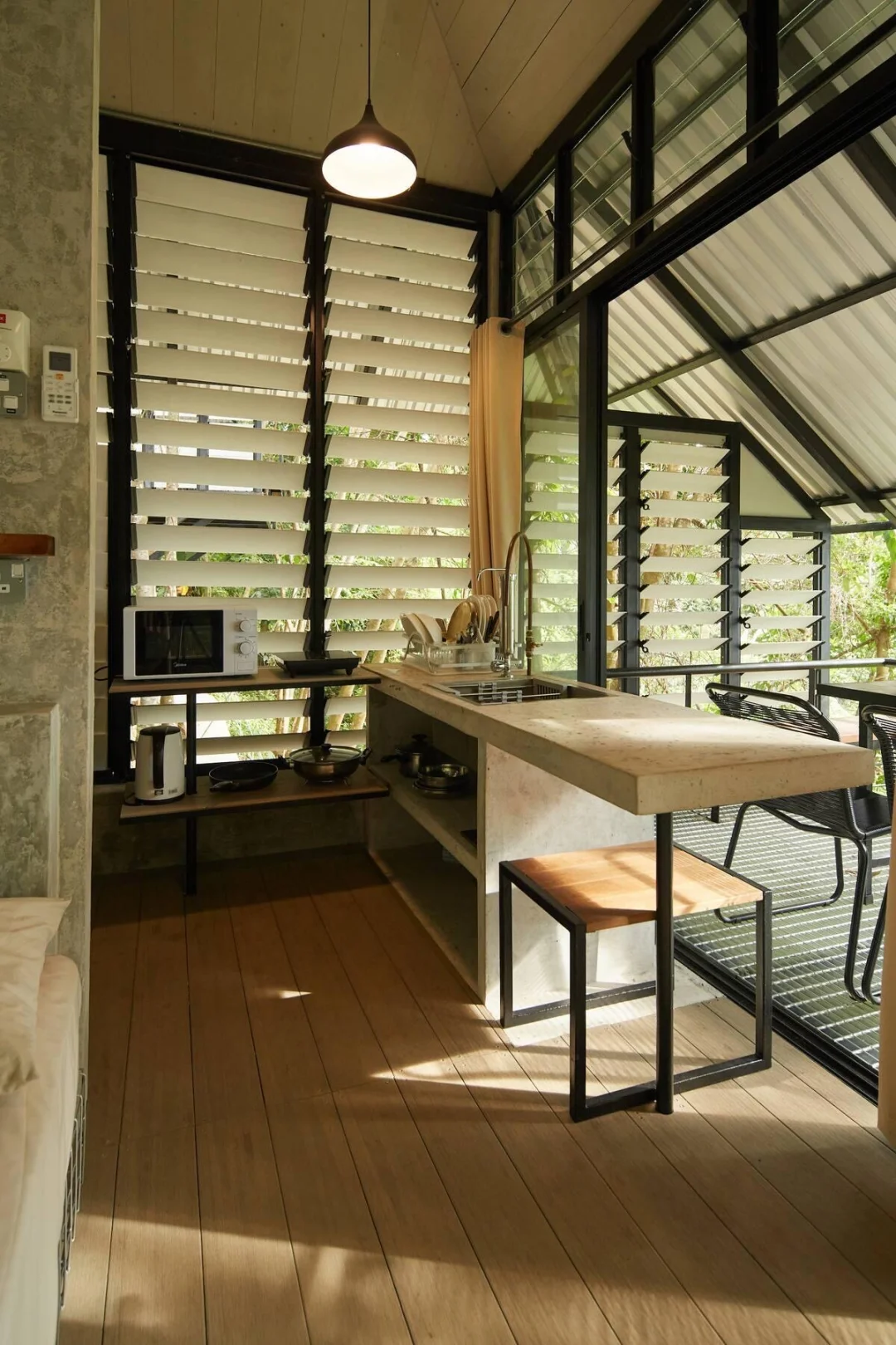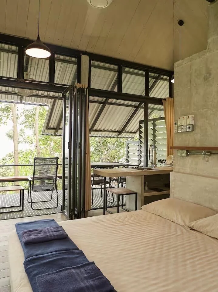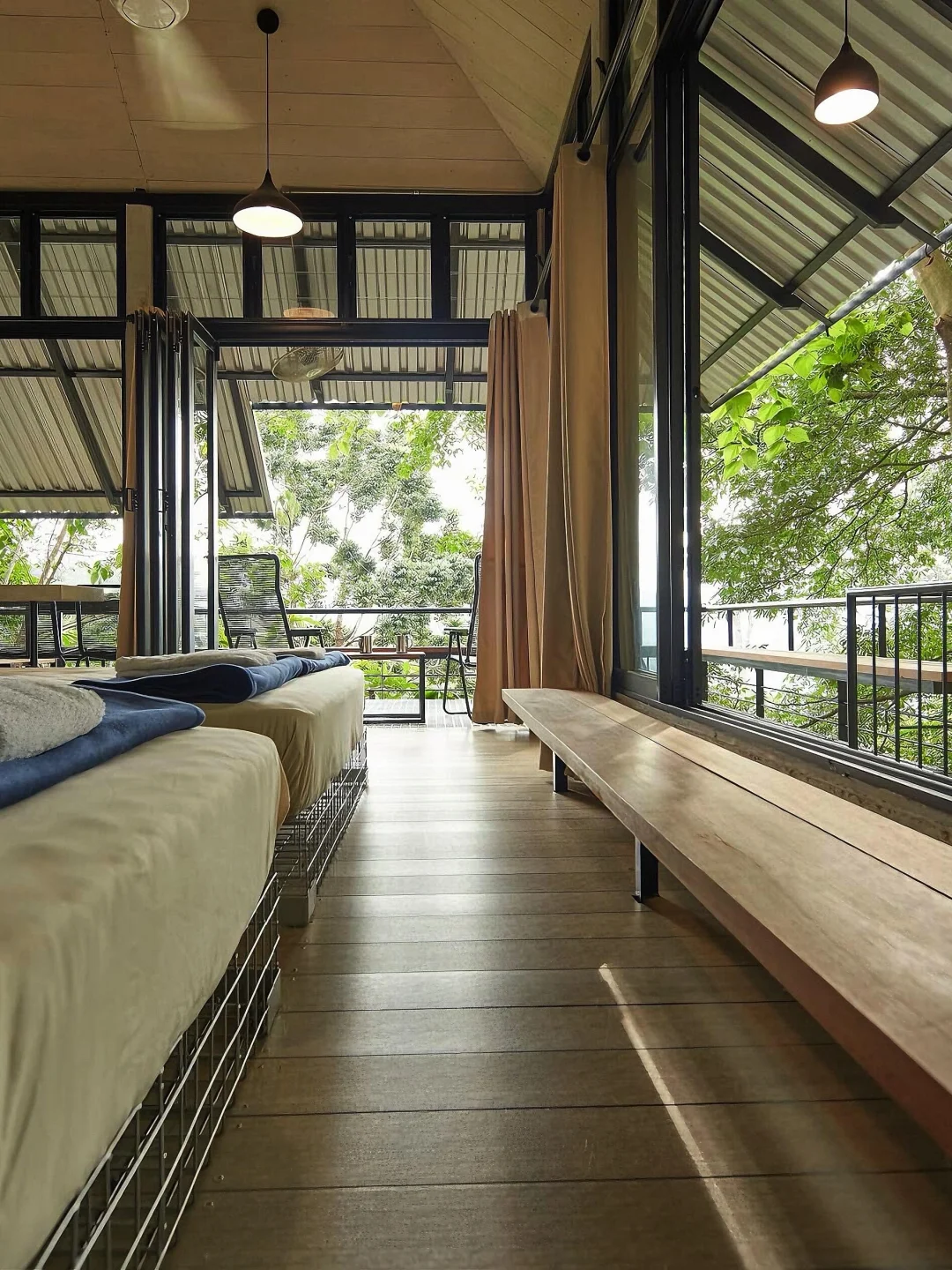 民宿的位置非常特殊,是一间藏在森林中的工业风别墅,周围全是茂密的树林,简直就像是一个隐藏的世外桃源,房间内的露台非常惬意,有长长的椅子供人休息,露台连接着卧室,房间内采光又好又宽敞,早上能起来看日出,傍晚的时候又能在山里看日落~