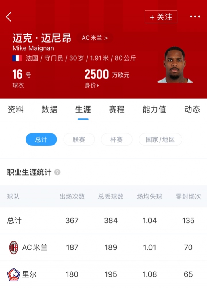 迈尼昂现年30岁,球员现德转估值2500万欧,本赛季,他代表米兰各赛事出战24场,做到11次零封。