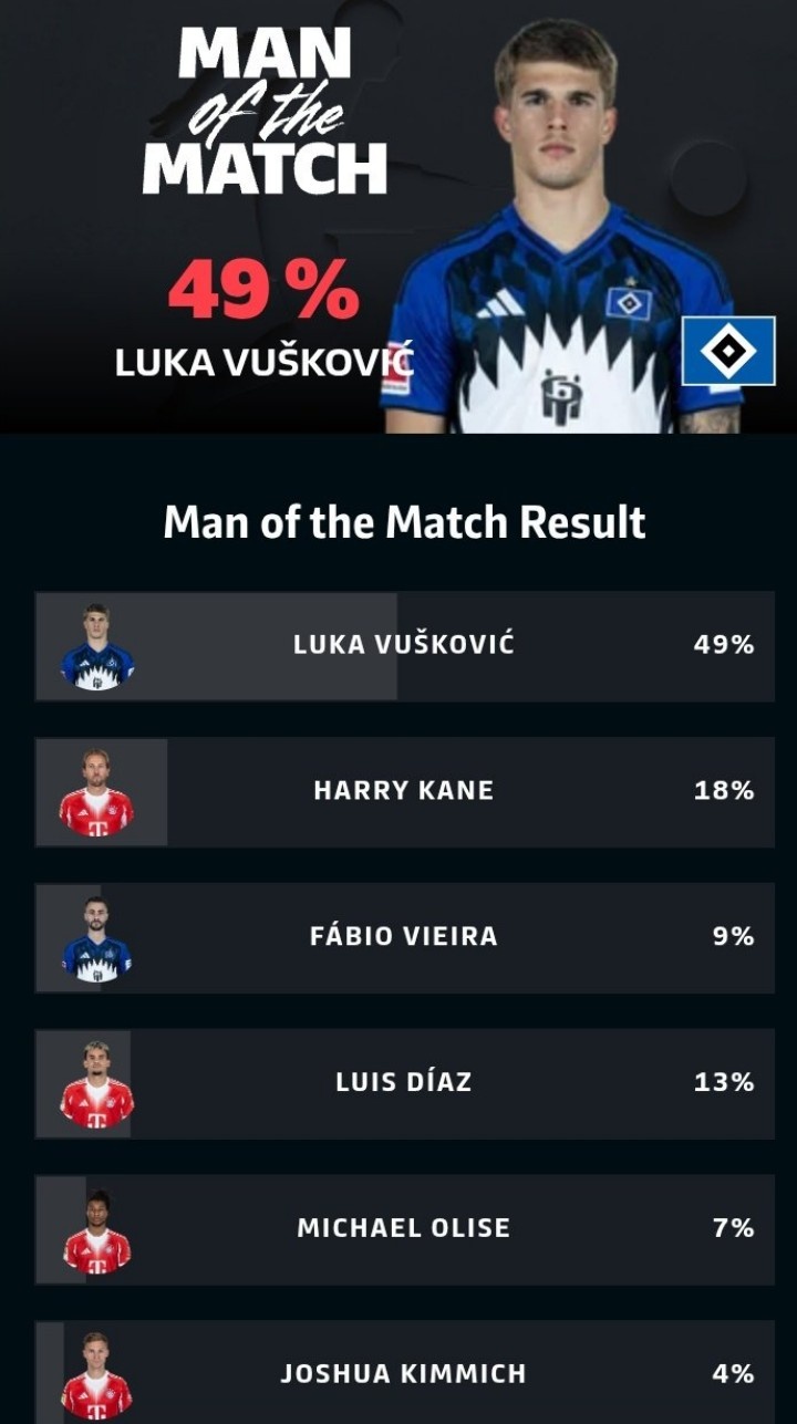 本场比赛汉堡球员武什科维奇打进扳平进球,赛后以49%的得票率当选本场最佳球员,凯恩以18%排名次席。