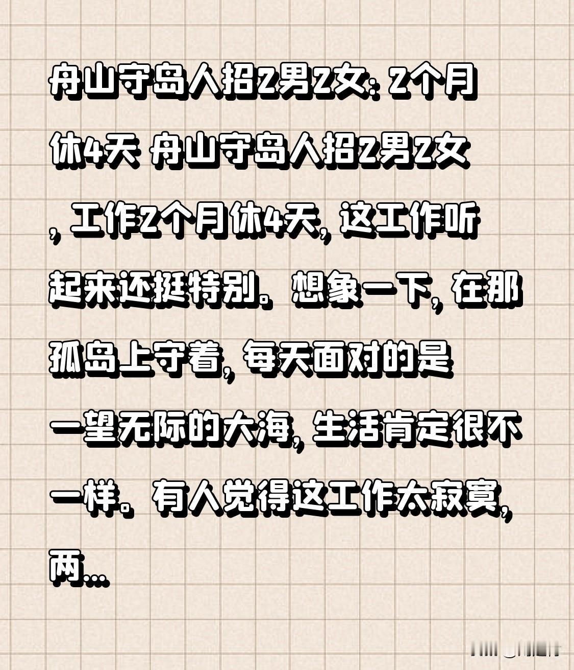 舟山守岛人招2男2女:2个月休4天 舟山守岛人招聘2男2女,工作2个月休4天。这工作听起来颇为特别。想象一下,在孤岛上驻守,每日面对的是广袤无垠的大海,生活定然与众不同。 有人认为这份工作太过孤寂,两个月里大多时间只能与大海和岛上景色为伴,娱乐活动想必极少。但也有人觉得这是逃离城市喧嚣的绝佳契机,没有车水马龙,也没有复杂的人际关系。 然而,这份工作也存在挑战。岛上物资供应或许不太便利,遇到恶劣天气还需坚守岗位。不知最终会是哪些人应聘,开启这场独特的守岛之旅。