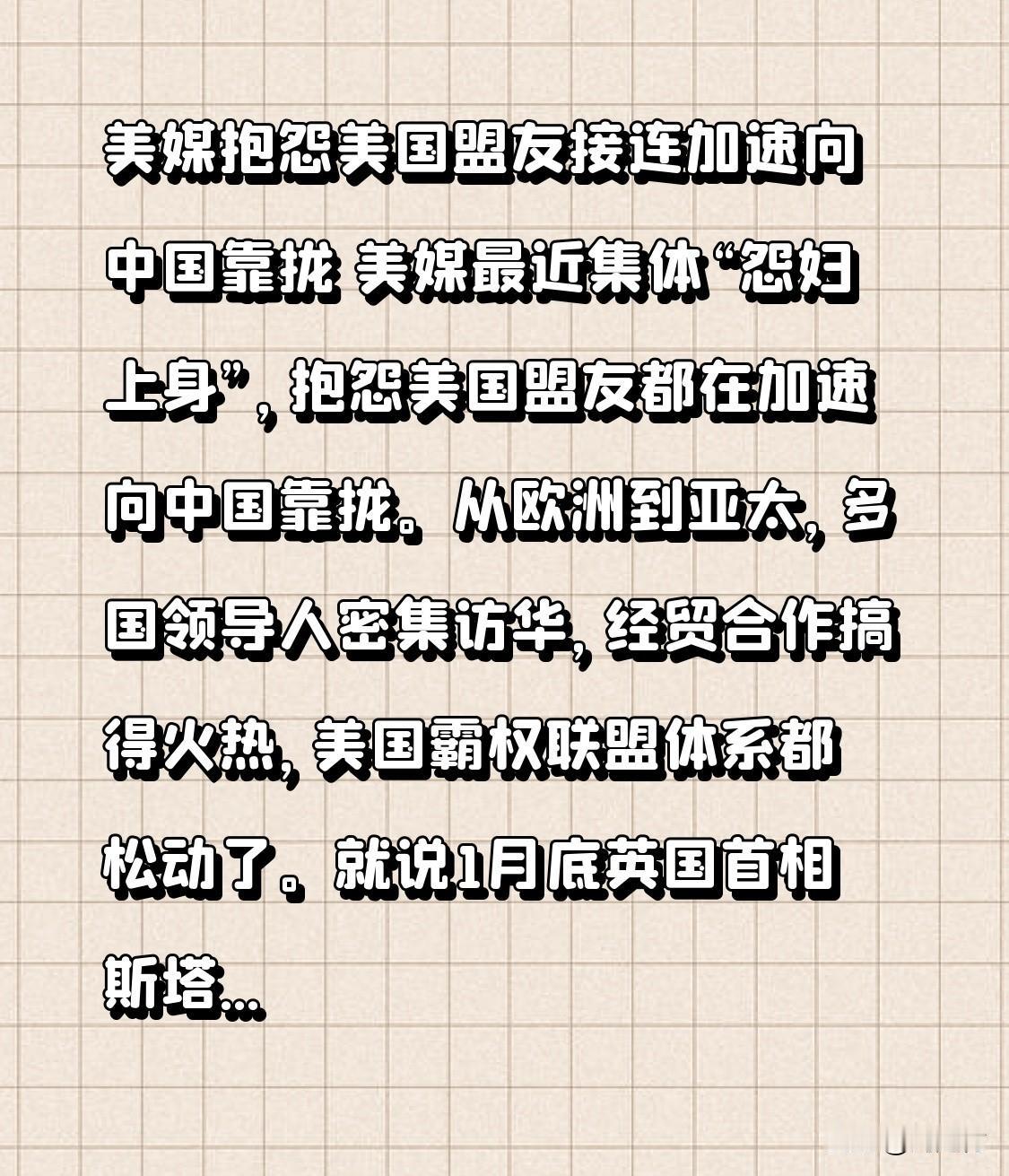 美媒抱怨美国盟友接连加速向中国靠拢 美媒抱怨美国盟友接连加速向中国靠拢 美媒近来集体化身“怨妇”,抱怨美国盟友纷纷加速向中国靠拢。从欧洲到亚太,多国领导人密集访华,经贸合作开展得如火如荼,美国的霸权联盟体系也出现了松动。 1月底,英国首相斯塔默访华,不谈及敏感议题,一心推动商业合作,还批准了中国驻伦敦新使馆的建设;加拿大总理卡尼访华时批评美国,称中国更为靠谱。过去七个月,五眼联盟中除美国外的成员国领导人皆已访华,此外还有韩国、爱尔兰等国。这些国家与中国的合作实现了实实在在的利益绑定,例如加拿大为了关税和市场,与中国达成了互惠互利。这并非中国主动拉拢,而是美国外交失道,中国互利共赢的理念更具吸引力,美媒抱怨也无济于事。