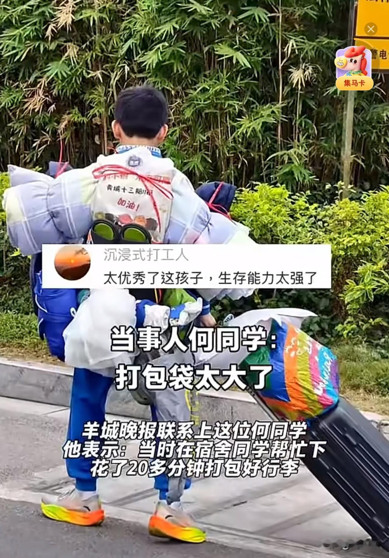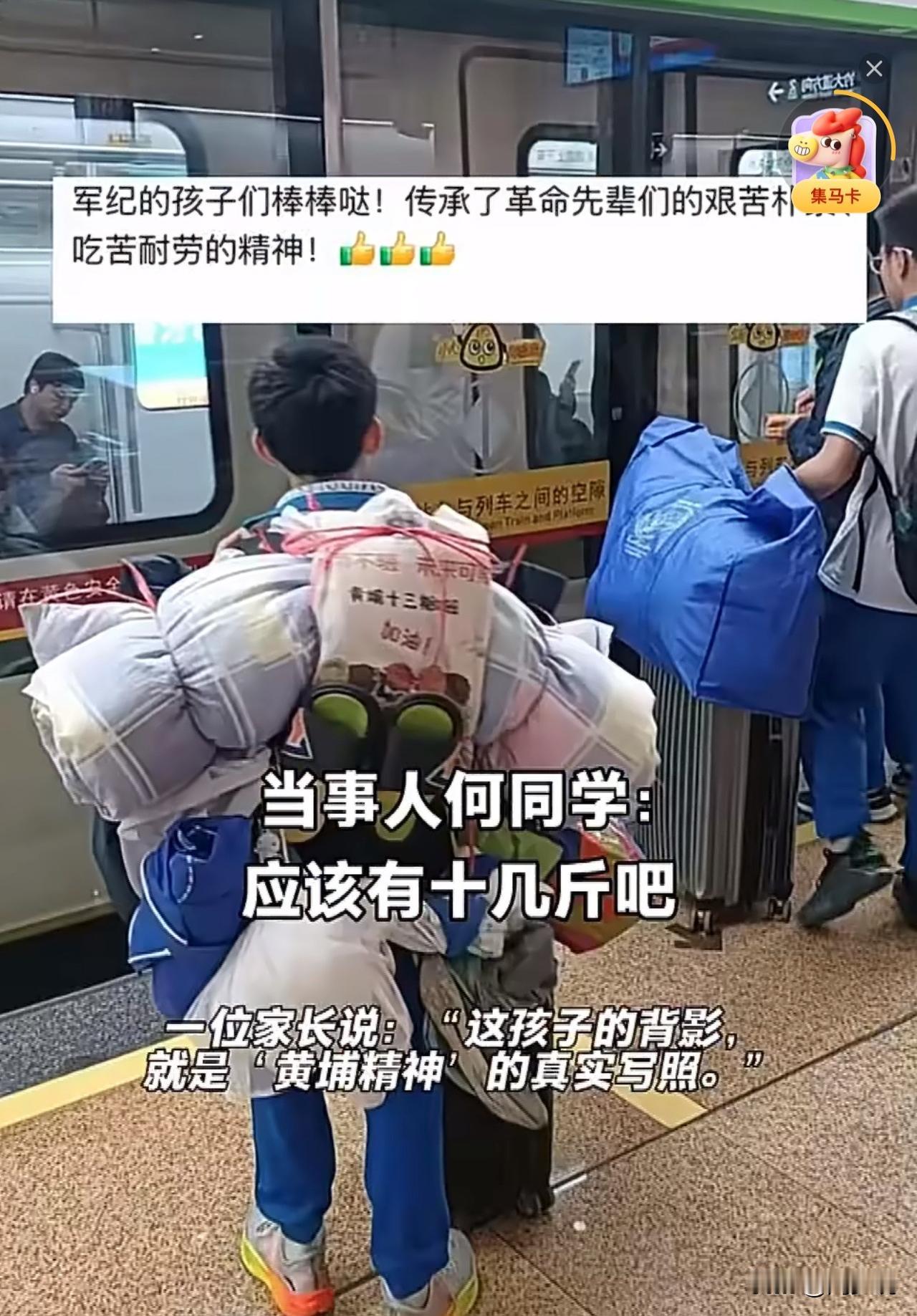 #广州一初中生独自背着被褥蚊帐坐地铁#“这位孩子前途无量!”近日,广州中小学放寒假,地铁7号站长洲站里,一个身影戳中了不少人。一名初中生独自背着鼓鼓囊囊的行李候车,被褥、蚊帐、鞋子层层叠叠,连一只“大湾鸡”玩偶都被裹在行李堆里,他的背影几乎要被这堆“小山”吞没,背包带深深陷进肩膀。 记者了解到,这名何同学是黄埔军校纪念中学的初二住校生,这些行李还是室友帮忙,花20多分钟才打包好的。这所学校实行半军事化管理,向来看重培养学生“懂感恩、能吃苦”的品性。 照片曝光后,众多网友感慨:“比起成绩单上的数字,这种自己扛的能力,说不定才是孩子未来最扎实的底气。” 周少想说这一幕之所以打动人心,恰恰是因为它藏着教育最质朴的底色。我们总在讨论怎样的教育才算成功,却常常忽略,吃苦的能力、独立的担当,这些看不见的品质,远比分数更能支撑孩子走得长远。 这所学校的半军事化管理,没有流于形式,而是实实在在落在了“让孩子自己动手”的细节里。可见,教育从来不是把孩子护在温室里,而是教会他们扛起行囊,大步走向人生的风雨里。#长沙新朋友# #寻美三湘#