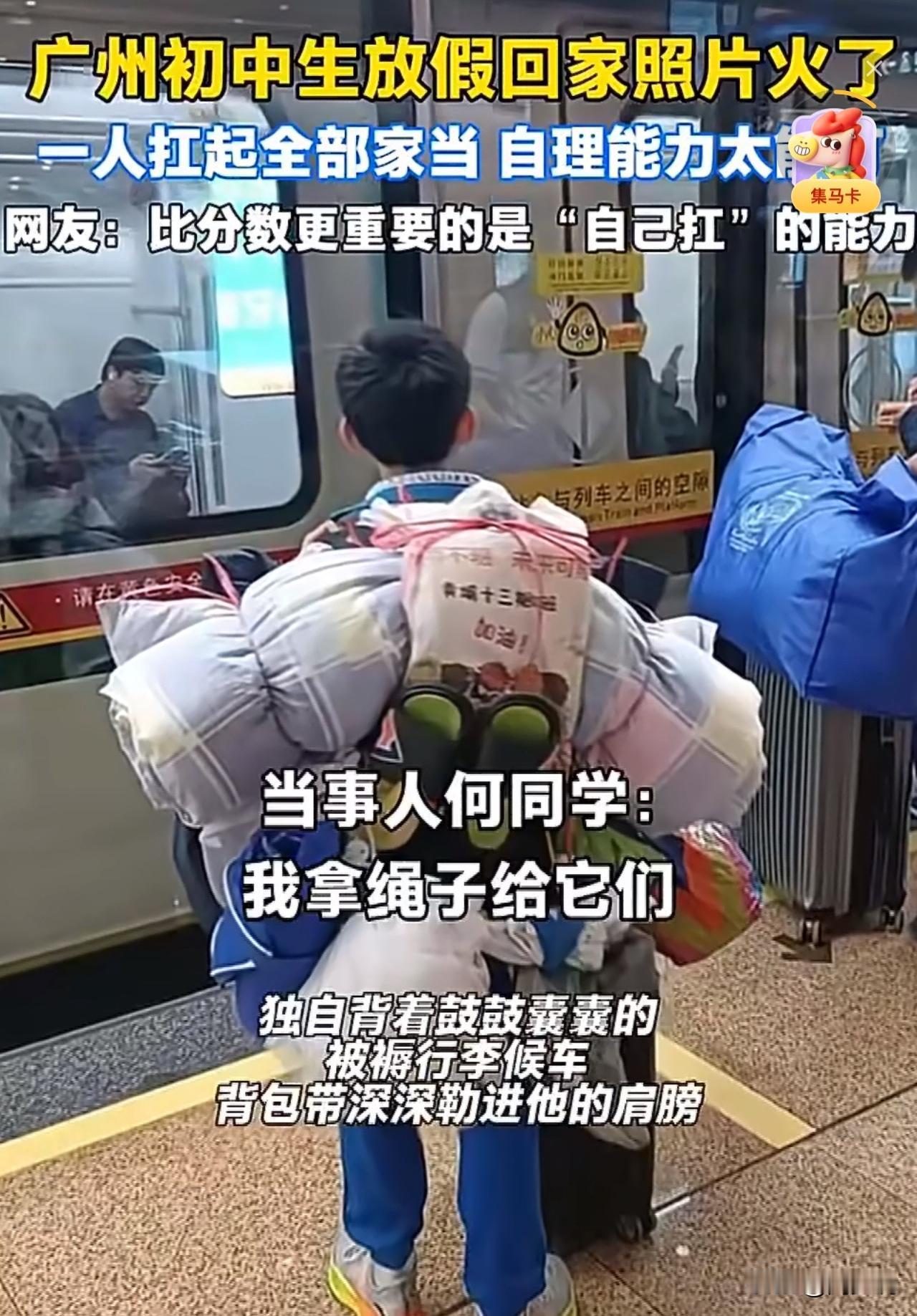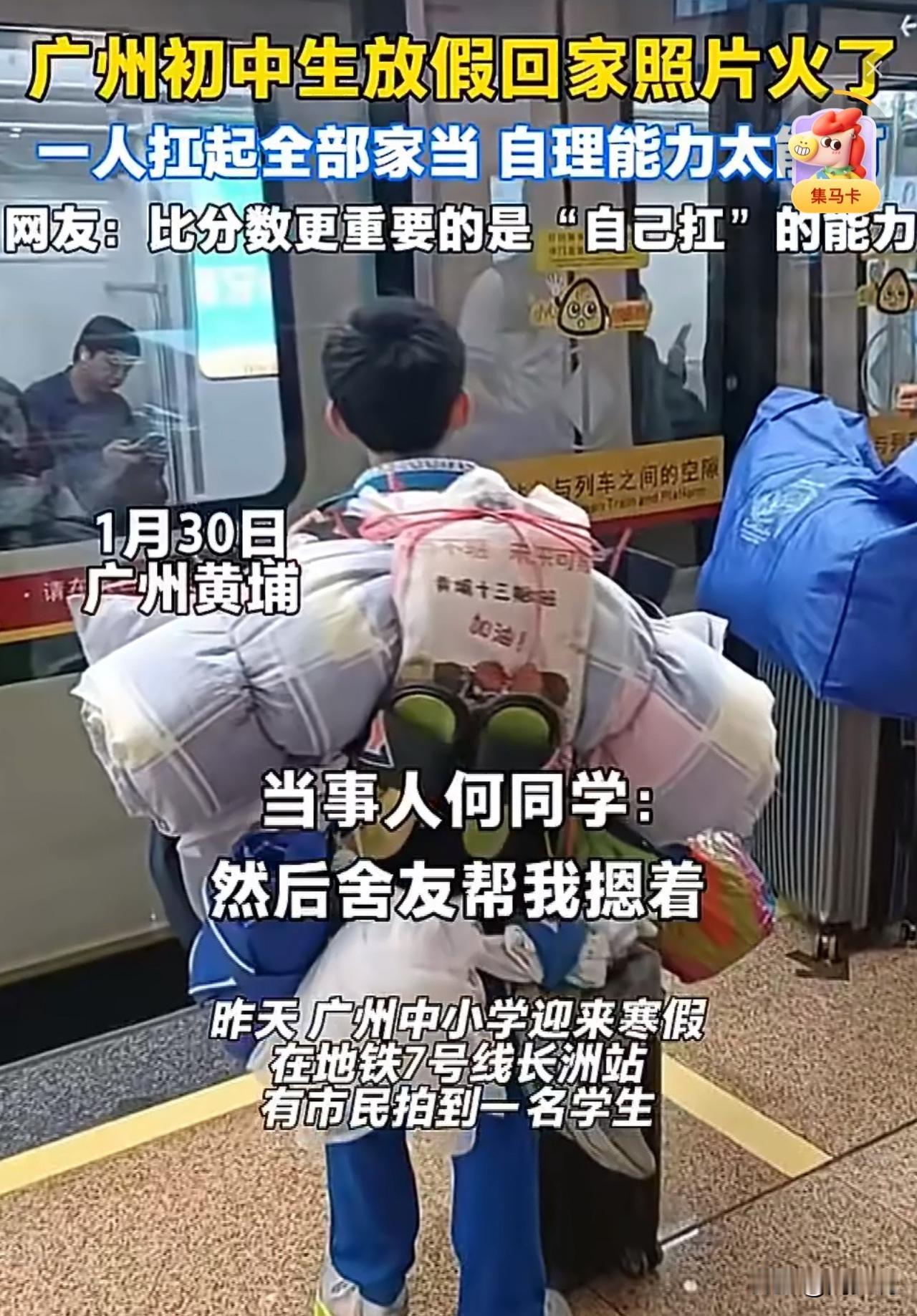 #广州一初中生独自背着被褥蚊帐坐地铁#“这位孩子前途无量!”近日,广州中小学放寒