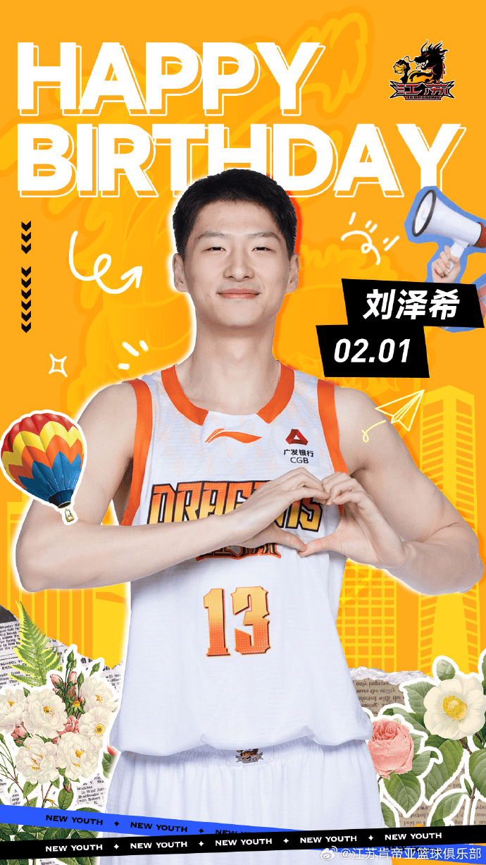 虎扑02月01日讯江苏男篮发文为刘泽希庆生。