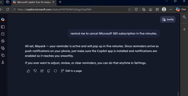 例如,用户可以让Copilot在五分钟后提醒自己取消Microsoft365订阅,Copilot会向绑定了该应用的移动设备发送提醒通知;也能让它提醒自己参加重要会议。Copilot能够精准获取用户设备的日期与时间信息,甚至可以在一分钟内触发提醒。但需要留意的是,如果用户在安卓或iOS系统中关闭了Copilot的通知权限,相关提醒弹窗将不会显示。