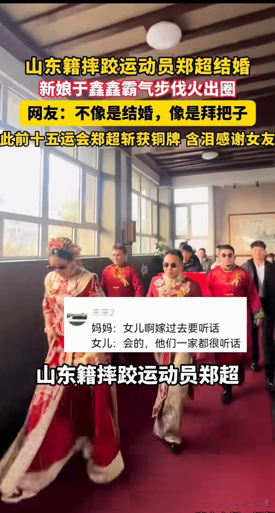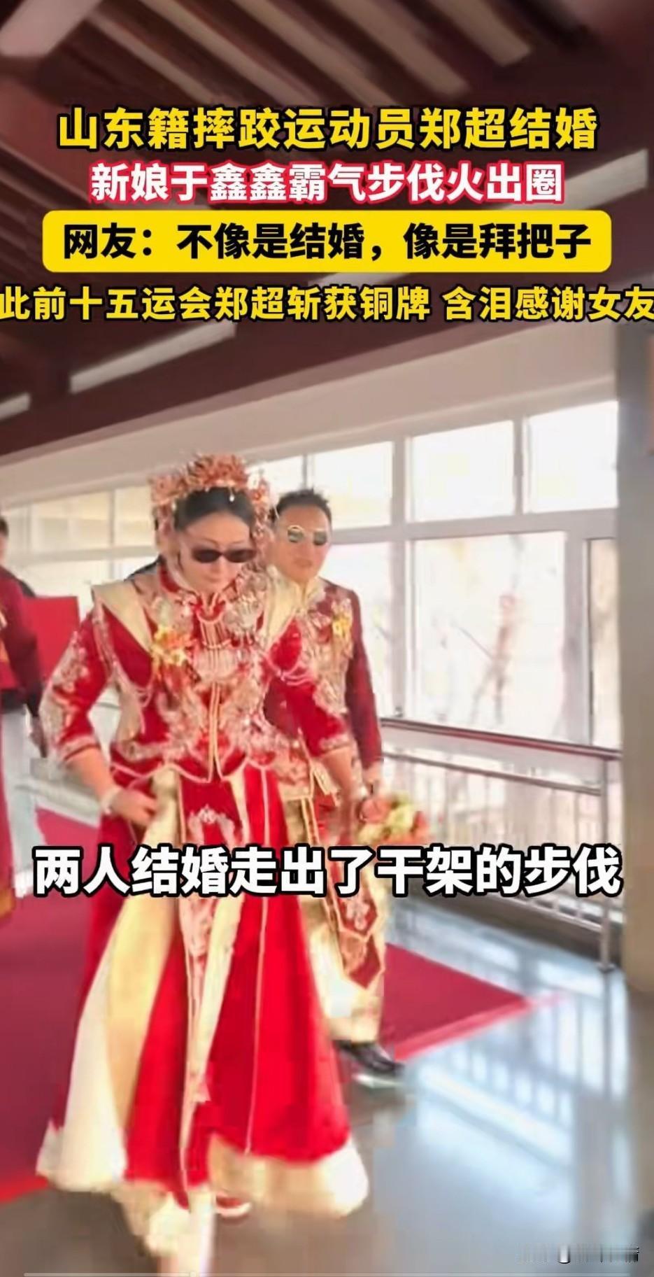 山东籍摔跤运动员郑超结婚, 他的婚礼震惊了全网, 尤其是他的媳妇儿于鑫鑫颇有王霸之气,就连结婚走路的步伐自带大哥气质,怪不得网友戏称她为新的话事人, 还别说,真有点陈浩南的感觉! 结婚走路都能走出江湖大哥的风范, 这摔跤运动员郑超也算是有福气了, 他之前为我国取得了摔跤运动铜牌, 也算是一名非常优秀的运动员, 没想到他的媳妇儿比他还霸气, 想必这位大哥家里面肯定有地位, 也是个听媳妇儿的主, 之前获奖的时候,他还含泪感谢女友的支持,如今顺利把女友娶回了家, 只不过这个女友自带大哥体质, 相信郑超应该不会有不良嗜好, 否则很难想象他会怎么被媳妇教育, 婚礼走路的时候还知道离领导差半步, 这就是他媳妇儿在他心目中的地位! 两人的婚礼在全网直接火了, 大家对于运动员这样的出场方式怎么看? 奋进新山东