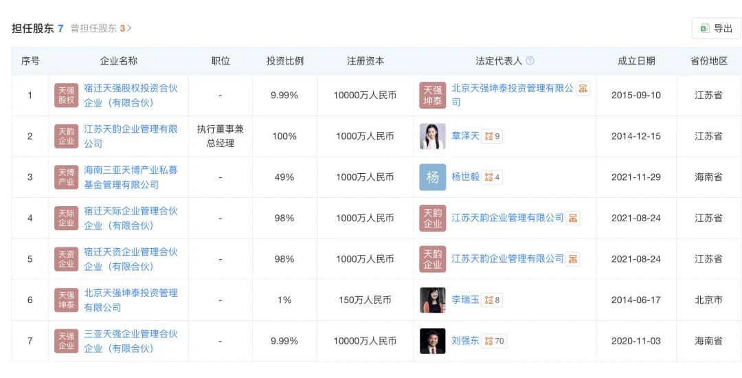 除了管理家族基金,章泽天名下还拥有多家投资机构,包括宿迁天强股权投资合伙企业、海南三亚天博产业私募基金管理有限公司、宿迁天际企业管理合伙企业、宿迁天资企业管理合伙企业、北京天强坤泰投资管理有限公司等。