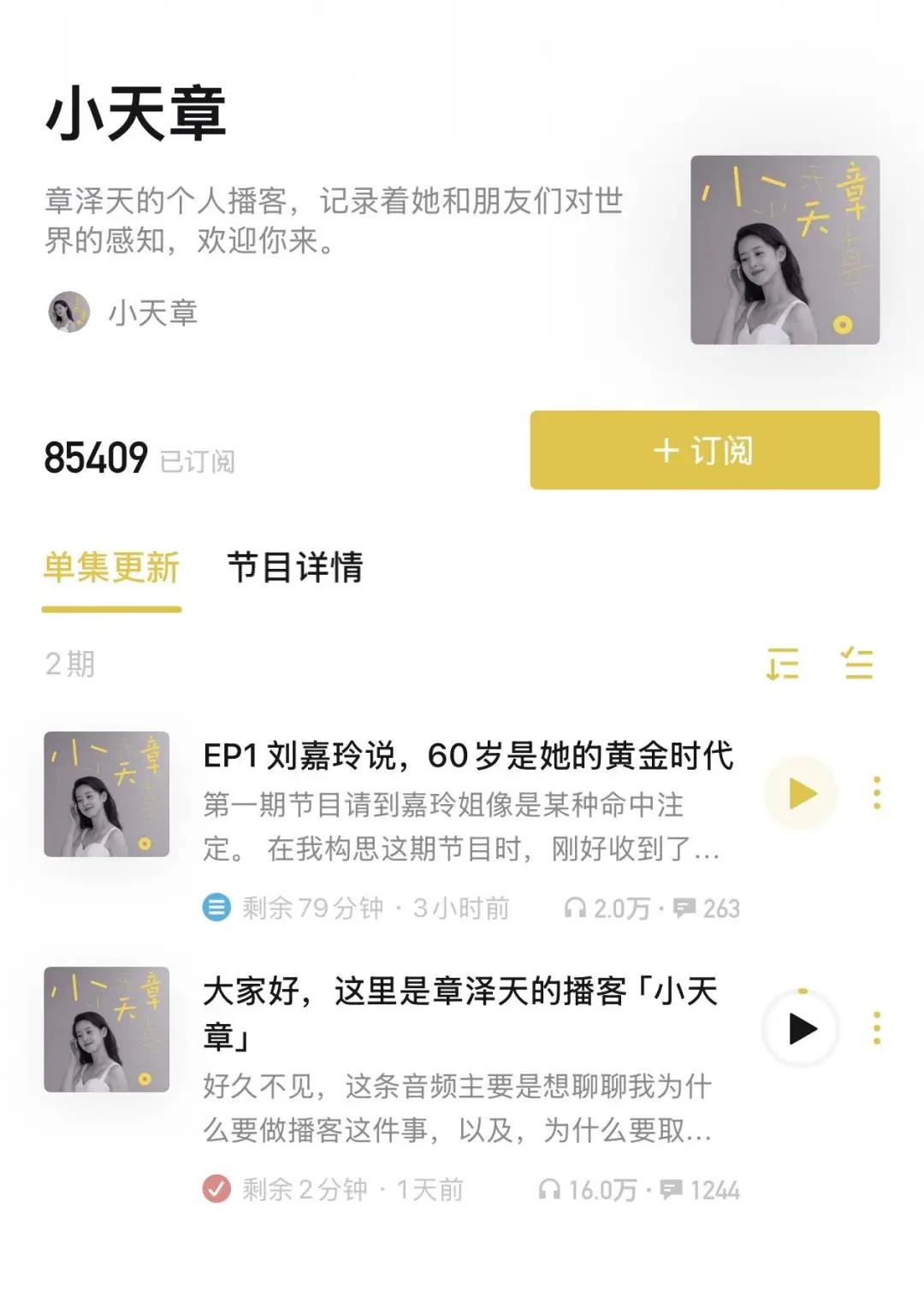 紧接着在小宇宙上线个人播客“小天章”,首期便邀请到刘嘉玲做客,4小时内收听量突破3万,话题#章泽天播客里的清醒#更是顺势冲上热搜。