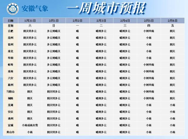 6日(周五):全省阴天,其中大别山区和沿江江南部分地区有小雨。