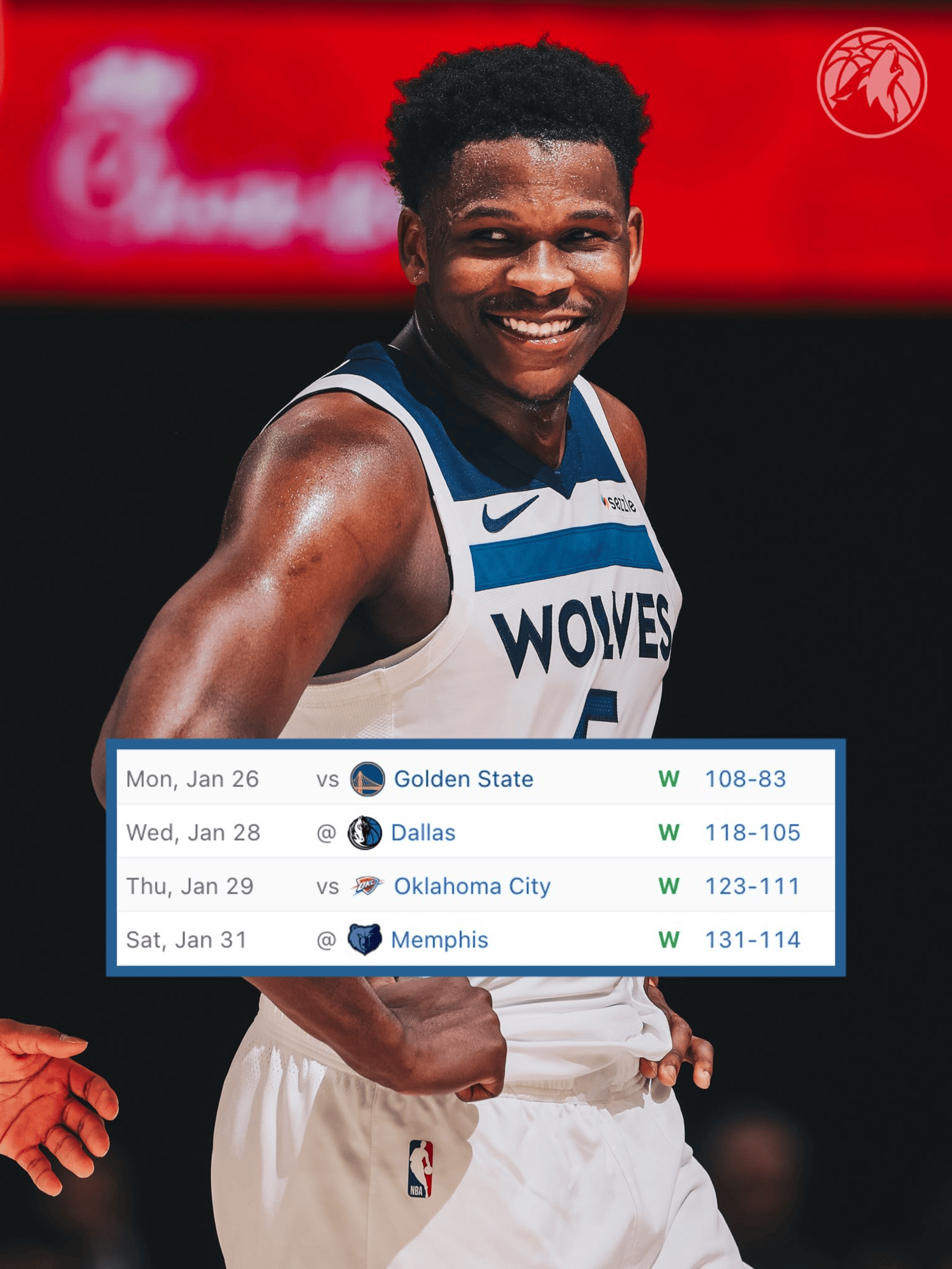 森林狼官方分享动态:我们拿到了西部目前现存最长连胜—4连胜。