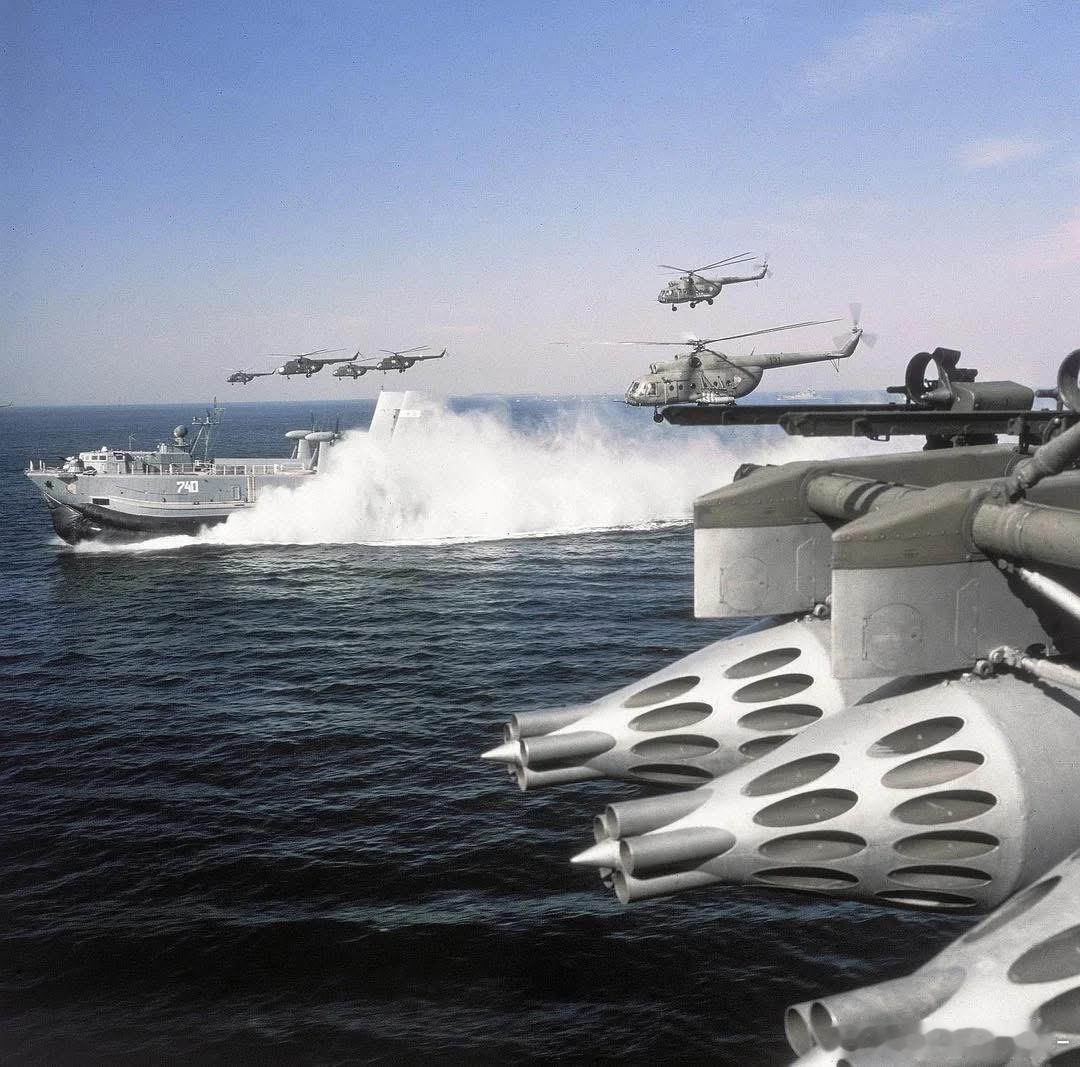 1977年7月在佩内明德附近海域举行两栖登陆演习的苏军12321型气垫登陆舰和东德Mi8机群。一旦三战爆发苏东陆战队集群将通过波罗的海进行两栖突击,支援正面战场;只不过老对手西方的陆战队也是这么想的中外舰闻军事历史全触达每天认识一件兵器