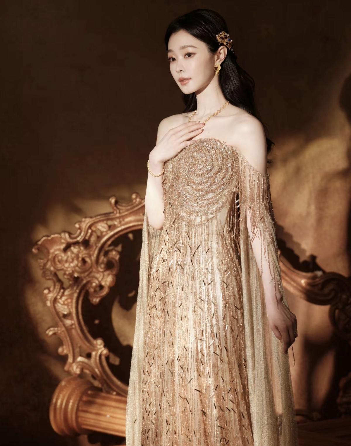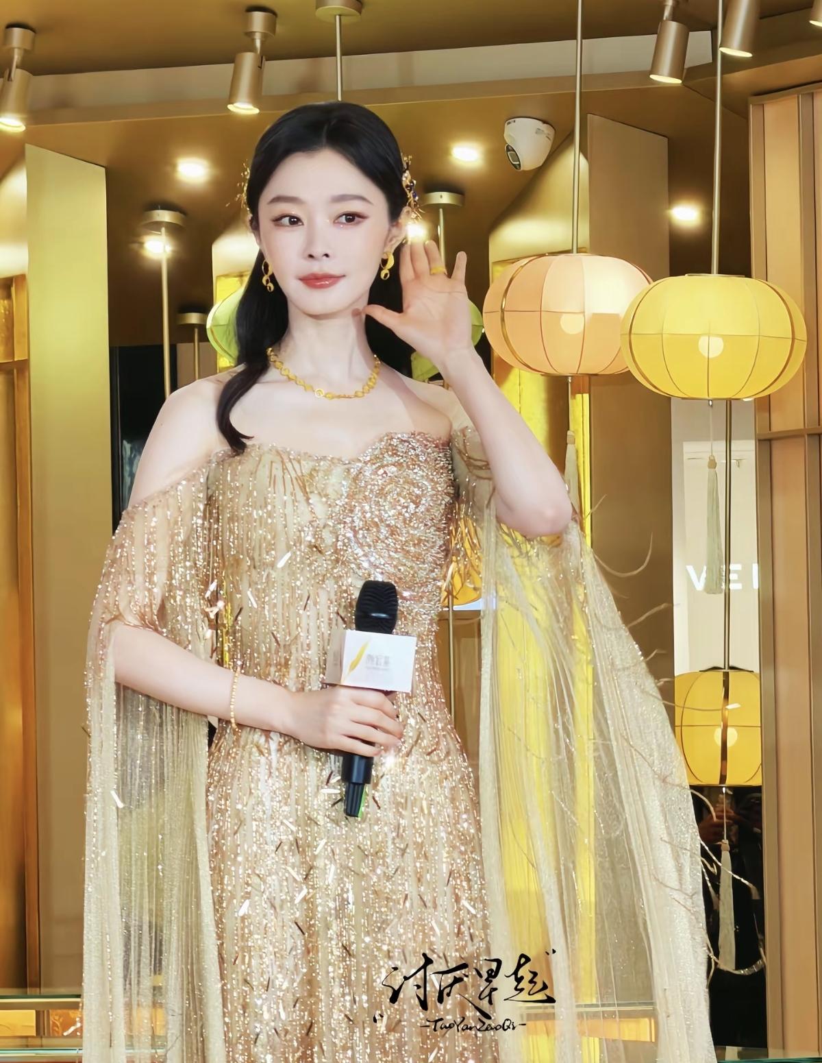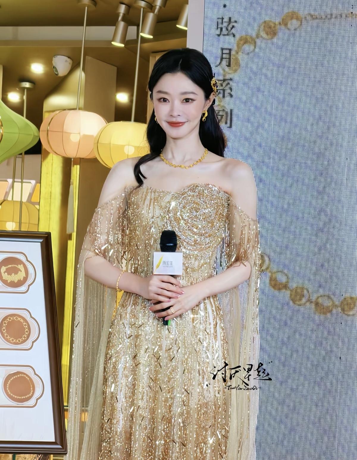 宋轶一袭鎏金礼服亮相活动,薄纱披肩衬得肩颈线条愈发精致,暖调碎钻在灯光下流动着光