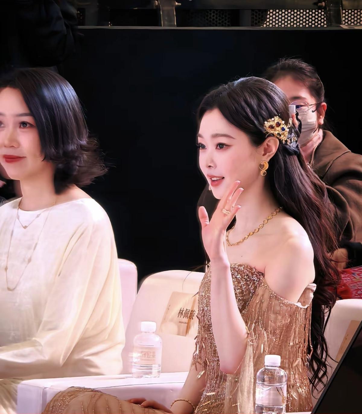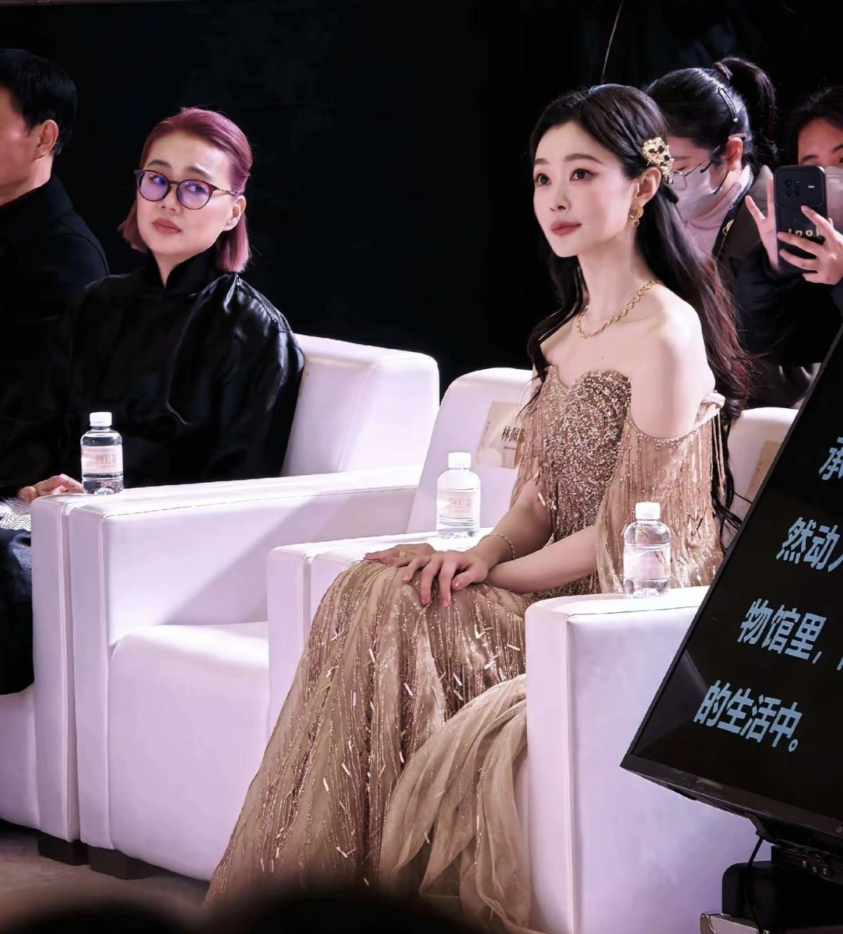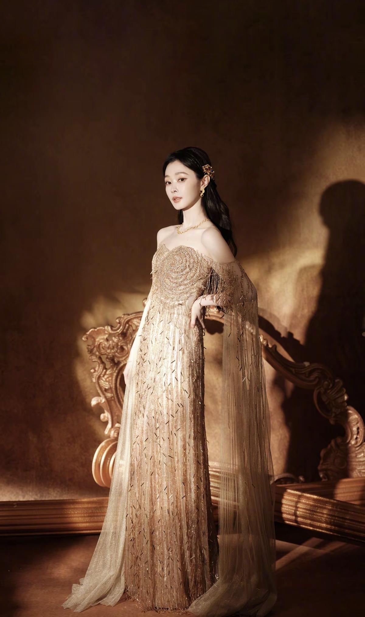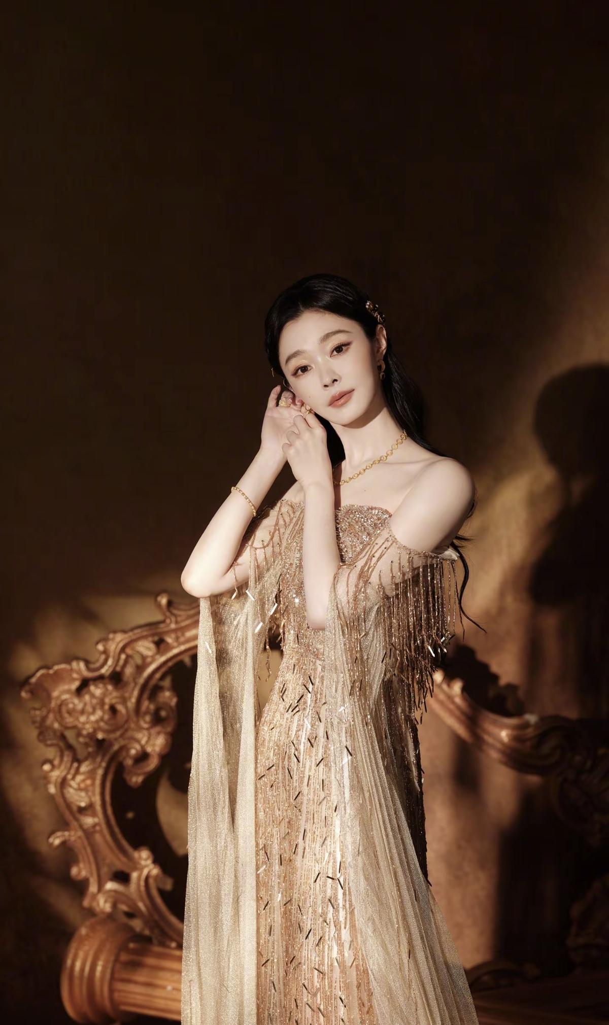 宋轶一袭鎏金礼服亮相活动,薄纱披肩衬得肩颈线条愈发精致,暖调碎钻在灯光下流动着光