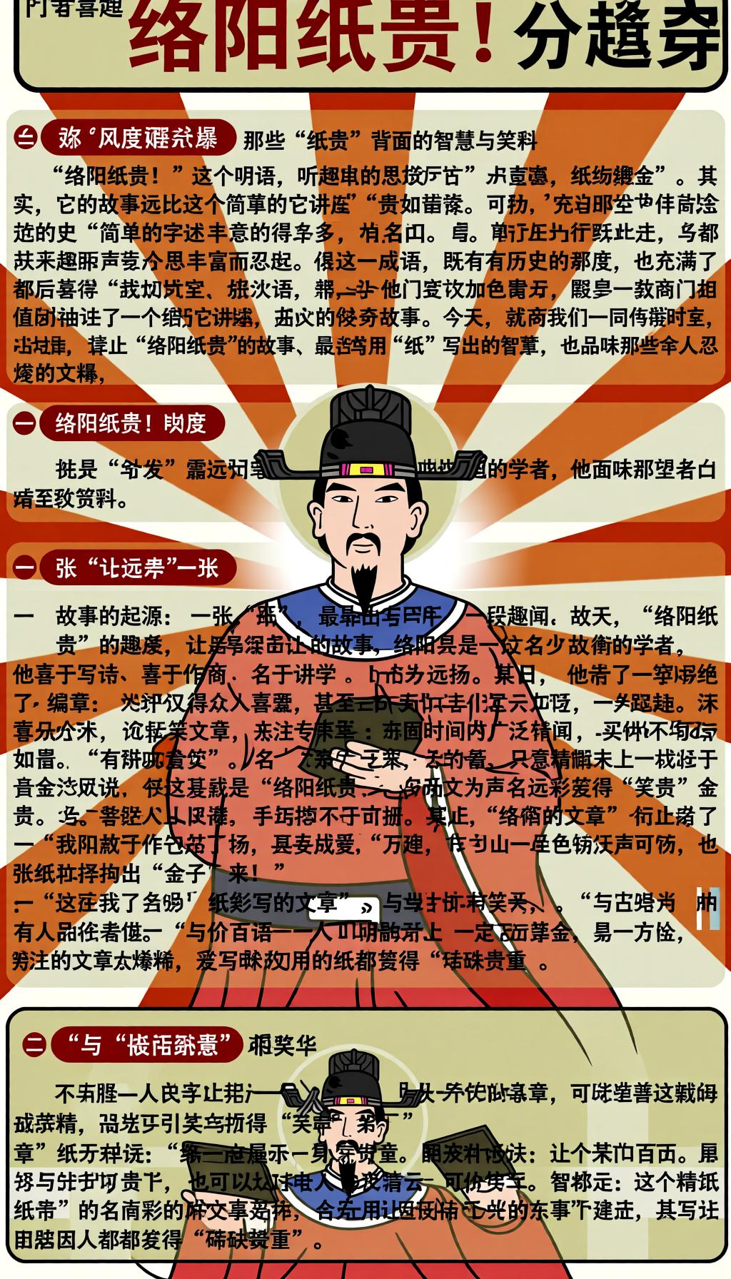 今天,就让我们一同穿越时空,走进“络阳纸贵”的故事,感受古人用“纸”写出的智慧,也品味那些令人忍俊不禁的笑料。 一、故事的起源:一张“纸”引发的风云 “络阳纸贵”的故事,最早出自东汉末年的一段趣闻。据说,东汉末年,络阳县有一位名叫张衡的学者,他善于写诗、善于作画、善于讲学,名声远扬。某日,他写了一篇文章,内容精彩绝伦,深得众人喜爱,甚至有人专程赶去求一睹风采。 这篇文章,竟然在短时间内被广泛传阅,甚至有人将它抄写成册,手抖都不敢出错。于是,“络阳的文章”变得炙手可热,纸张一度变得“贵如黄金”。有人开玩笑说:“只要能看上一眼张衡的文章,买张纸都得掏出‘金子’来!” 这就是“络阳纸贵”的由来——因为张衡的文章太火爆,连写文章用的纸都变得“稀缺贵重”。 二、成语的寓意:名声与价值的升华 “络阳纸贵”不仅仅描述了纸张的贵重,更象征着某个人或某件事因为声名远扬而变得“金贵”。它告诉我们:名声的力量,可以让普通的东西变得稀缺,也可以让普通人一夜之间“身价百倍”。 这个成语也暗示了“名声的双刃剑”——一方面,声名可以带来荣耀和财富;另一方面,过度的关注也可能引发“纸贵”的尴尬,让人“身不由己”。 三、趣味插曲:古人也会“纸贵”成笑料 “络阳纸贵”的故事听起来庄重,但其实古人也懂得用幽默来调侃自己。比如,有人说:“要是我也能写出一篇‘络阳文章’,那我家门口的纸都得‘纸贵’三倍了!”这句话看似调侃,实则暗藏对名声的向往。 更有趣的是,有人为了“炒作”自己,特意写了一篇“神奇文章”,在市场上广泛传播,结果“纸”变得“贵如黄金”,引得坊间笑谈不断。 这告诉我们:古人也懂得“炒作”,甚至能用“纸贵”来调侃自己,展示了他们的智慧和幽默。 四、古代“纸贵”的智慧:借“纸”谋略 “络阳纸贵”不仅仅是个成语,更折射出古人用智慧谋取利益的巧妙手段。 1. 以“纸”作媒,宣传自己 古人懂得借助“纸”的价值,来宣传自己或某件事。例如,书生们会写“广告”贴在街头,用“纸”表达自己的才华和志向。这样一来,“纸贵”也变成了“名声贵”,吸引更多人关注。 2. 利用“纸贵”制造话题 一些商人会故意制造“纸贵”的假象,吸引顾客上门。比如,某药铺在药方旁边写上“此药只此一份,纸贵如黄金”,其实不过是用来增加神秘感和价值感。 这说明,古人善于利用“纸”的象征意义,制造话题、提升价值,既是智慧,也是幽默。 五、现代启示:用“纸贵”智慧“赚”一把 到了现代,“纸贵”变成了“品牌效应”或“话题制造”。企业通过炒作、宣传,让产品“纸贵”起来,从而赢得市场。 比如,某品牌推出限量版,宣传“只此一份,纸贵如黄金”,结果引发抢购热潮。这种策略,既是古人的智慧,也是现代的“幽默”。 同时,“纸贵”也提醒我们:在追求名声的同时,要保持理智,不要“纸贵”到失去自己。
