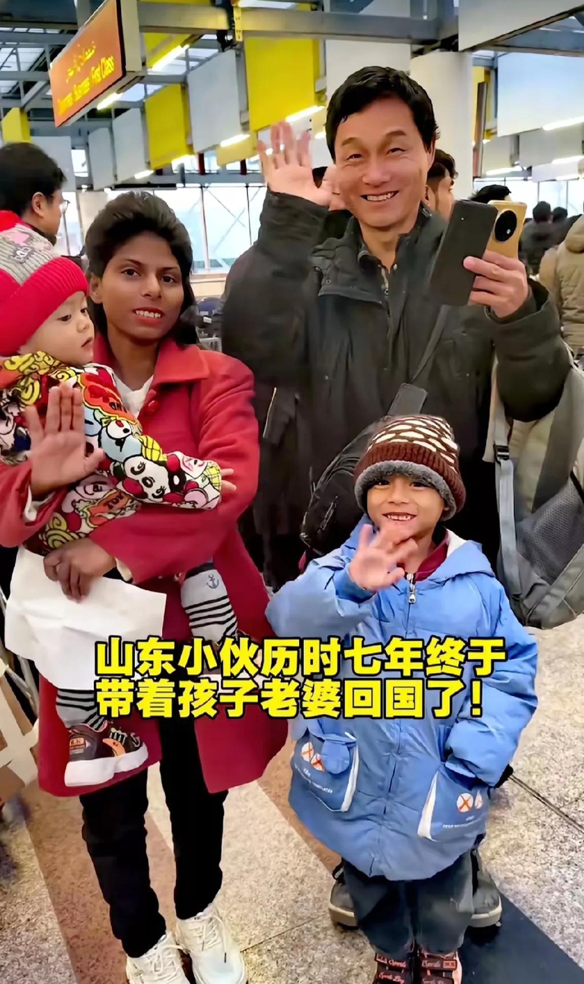[小涛带一妻二子回国,是近年来少有的感人故事。] 小涛是个聋子,也不认识几个字,连从巴基斯坦回国的流程都看不懂,所以滞留在巴铁整整七年,也回不了国。 所幸碰到小宋(东方宋),小宋何等精明,三下五除二,极利索地就帮小宋一家四口把他们回国的护照办妥了。 小涛回国后,小涛妈妈对这个巴铁儿媳妇紧紧搂抱,一刻也不松手,转身又对两个亲孙子亲了又亲。 一个聋儿,没多少文化,长得又遗憾。这种情况在国内是讨不到老婆的。 在巴铁零彩礼娶一儿媳,还带了两个大胖孙子回来,仿佛凭空从哪冒出来的。 你说小涛妈妈高兴不?当然高兴。 有人说儿媳妇反差太大,皮肤太黑。不接受小涛讨这样的媳妇。算了吧,如果你是小涛妈妈,也会为小涛高兴。