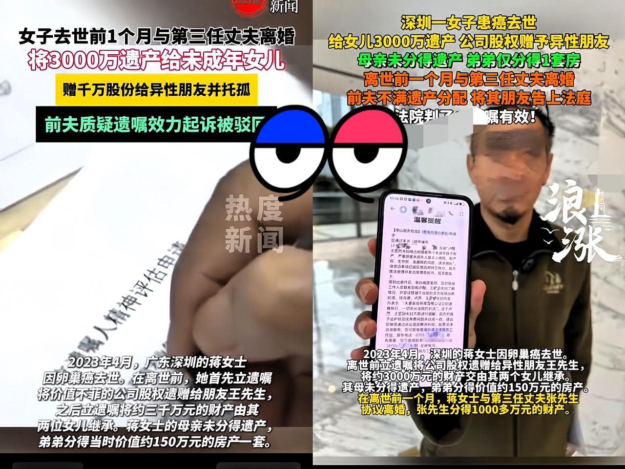 深圳有个女老板,活着通透, 自己快不行了,先甩给老公1000万, 让他赶紧离婚走人,然后 立下遗嘱,几个亿家产,大多给了外人,亲妈竟一分没有! 3000万给俩女儿,三家公司交15年靠谱朋友,还让其当女儿监护人,亲妈和弟弟得到极少! 这可不是绝情,而是看透了人心。从小被母亲苛待、弟弟冷眼,这样的亲情本就没分量! 15年的挚友,比血缘更值得托付。前夫起诉败诉,更证明她有远见,财富分配,藏着对家人的清醒认知。 你觉得她这遗嘱合理吗?我们评论区聊聊~