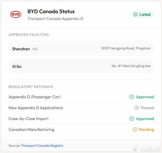 从运输法规信源看,据第三方车辆注册数据库显示,比亚迪汽车已出现在加拿大运输部(Transport Canada)公开的 Appendix G 注册名单中,这意味着比亚迪作为制造商已具备向加拿大市场进口乘用车的基础“入口许可”。换句话说,其部分车型在技术与合规层面已具备销售可能性。尽管如此,比亚迪在加拿大尚未建立大规模经销和售后网络,其市场化操作仍在筹备中。
