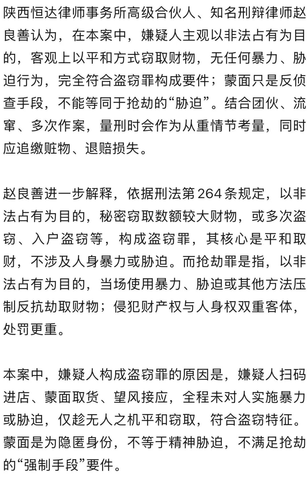 1月27日凌晨,一对蒙面男女在湖南永州一家无人便利店抢走价值6000元的香烟,一天后落网,其作案视频也引发网友热议:“0元购”无人值守的便利店,到底是属于盗窃还是抢劫呢?1月31日,陕西恒达律师事务所高级合伙人赵良善分析称,嫌疑人客观上以平和方式窃取财物,无任何暴力、胁迫行为,蒙面是反侦查手段,不能等同于抢劫的“胁迫”,故构成盗窃罪。