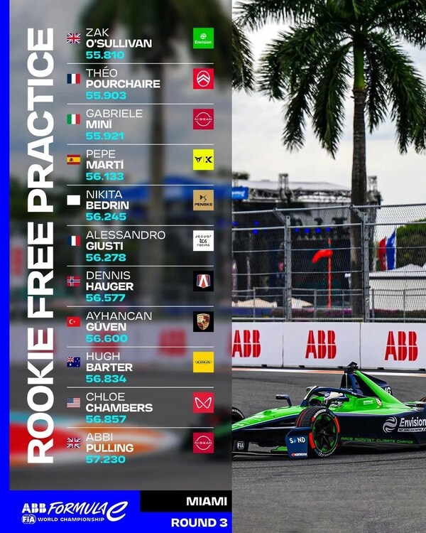 FE电动方程式于1月30日在迈阿密举办了40分钟的特别练习赛,为新秀车手提供驾驶最新一代FE赛车——GEN3Evo赛车的机会。此前,新秀测试曾在吉达、罗马和米萨诺成功举行。