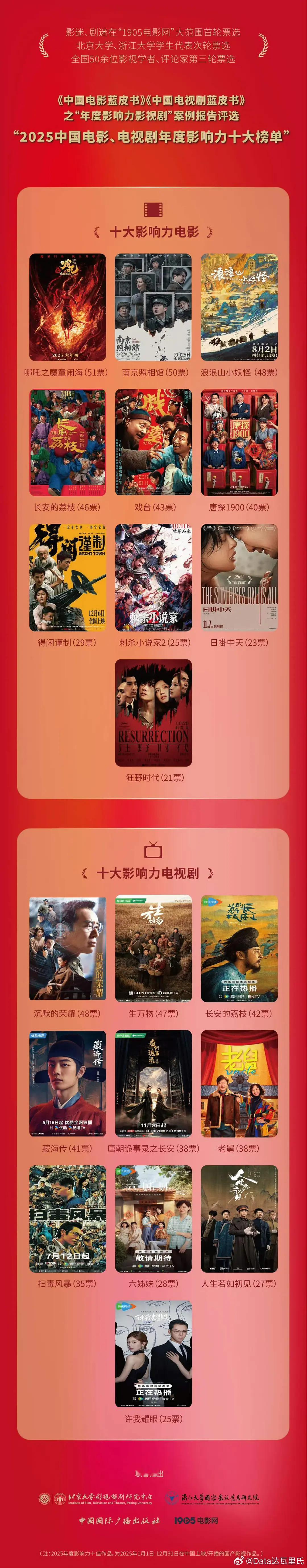 2025中国影视蓝皮书 【十大影响力电影:】👑哪吒之魔童闹海(51票)🥈南京照相馆(50票)🥉浪浪山小妖怪(48票)④长安的荔枝(46票)⑤戏台(43票)⑥唐探1900(40票)⑦得闲谨制(29票)⑧刺杀小说家2(25票)⑨日掛中天(23票)⑩狂野时代(21票)