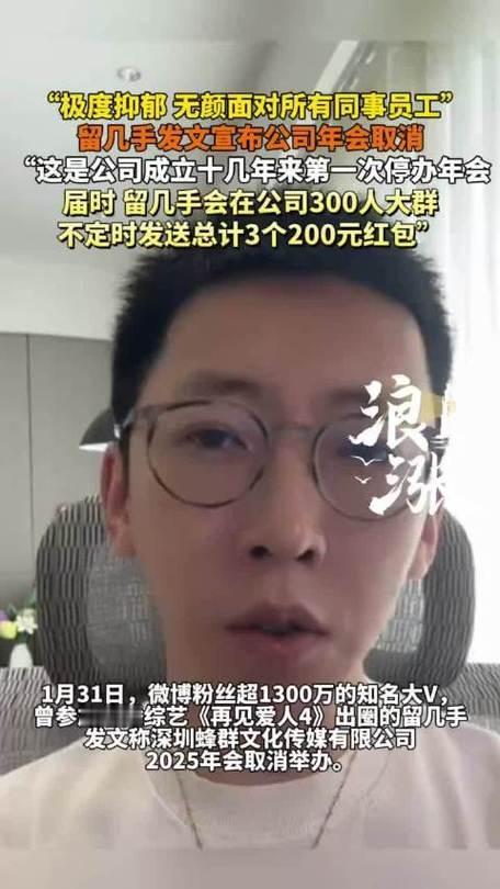 1月31日,网红留几手发盖公章通知,宣布取消公司十余年来首次停办的年会,坦言因家庭破裂被群嘲、事业全面滑坡致心情抑郁,无颜面对员工,愿担全责。他还称将用直播卖鸡爪的收入,在公司群发3个200元红包作补偿,其持股公司此前已被列经营异常。留手哥 留字日常