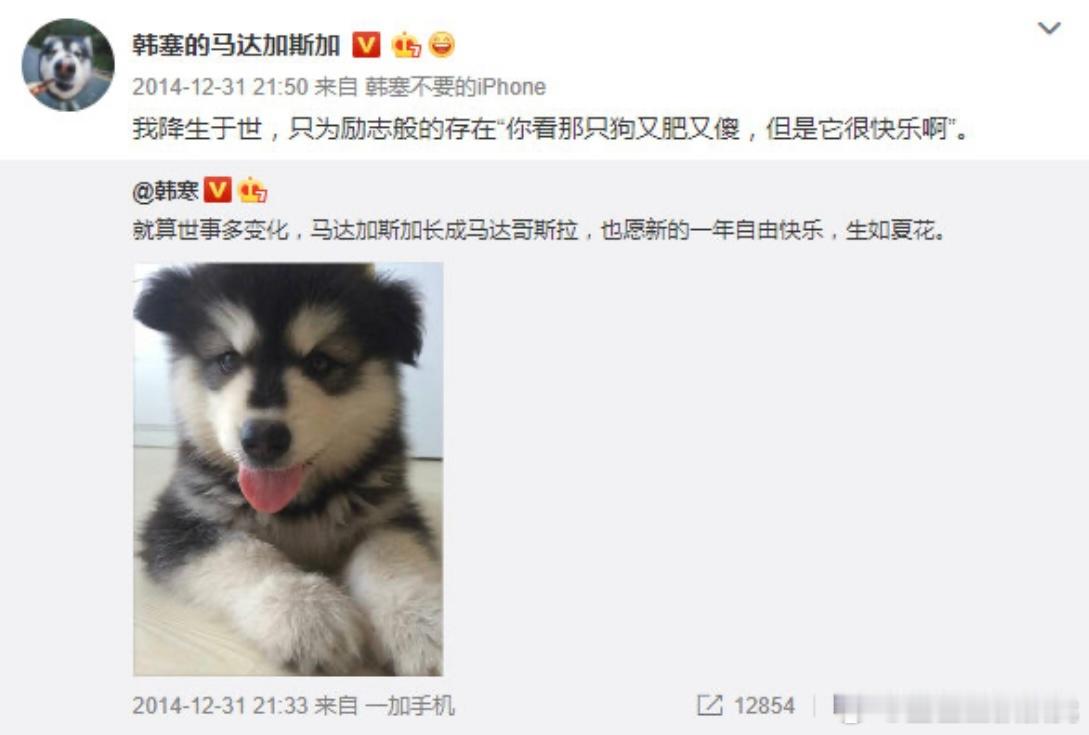 韩寒的阿拉斯加犬马达已经是时代的眼泪了吗当年还关注过它的微博,没想到儿子是黄晓明