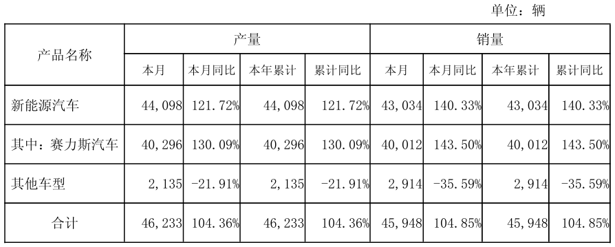 2月1日,赛力斯(601127/09927)发布公告,2026年1月份的产销数据情况如下:公司新能源汽车的产量为4.41万辆,同比增加121.72%;销量为4.3万辆,同比增加140.33%。