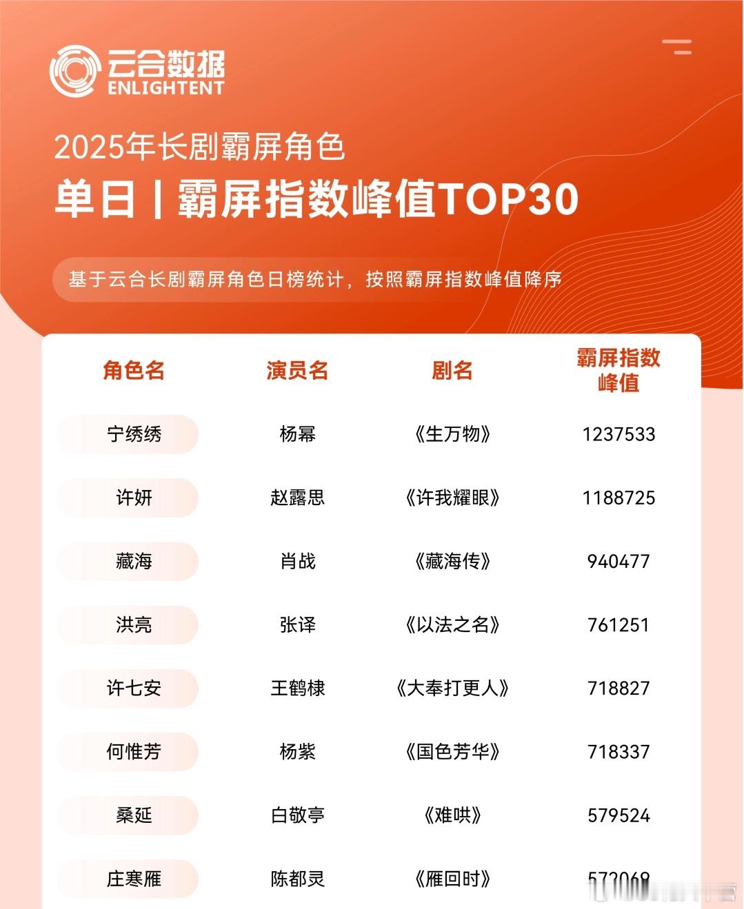云合2025长剧霸屏角色·单日霸屏指数峰值杨幂|宁绣绣就这样稳坐船头,成为TOP