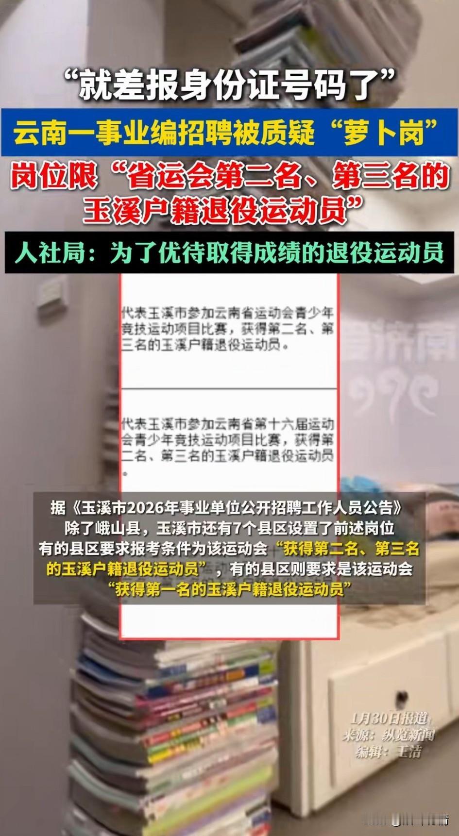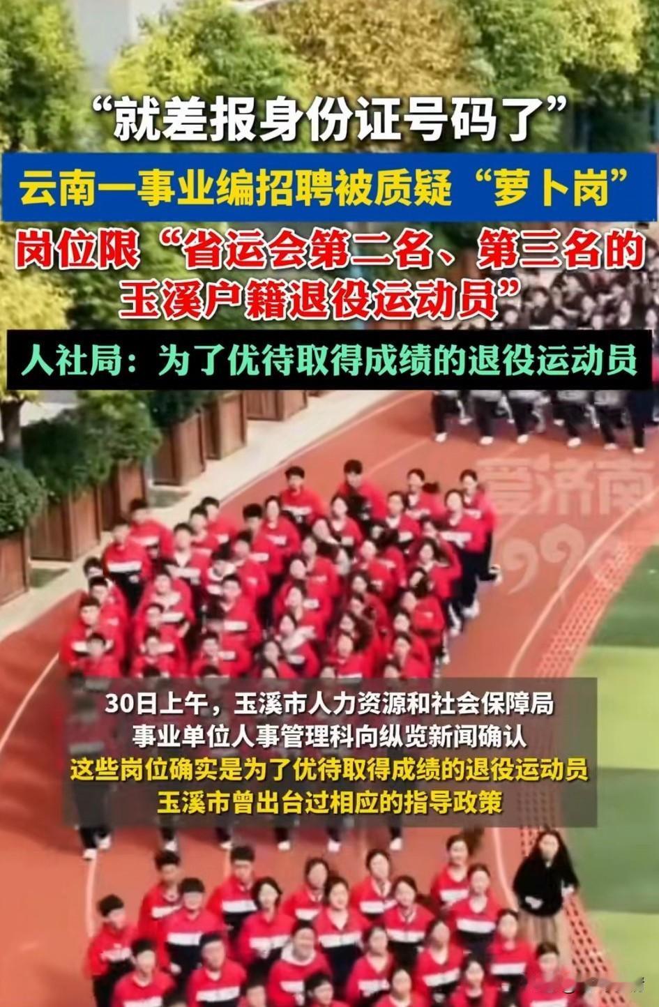 云南一事业编招聘被质疑萝卜岗, 岗位条件太明显了, 仅限省运会第二名,第三名的玉溪户籍退役运动员,这可是出现在2026年事业单位编制招生考试上的, 这条件未免太过具体了, 网友笑称就差报身份证号了, 有些地方是要求获得第一名的退役运动员,这些消息一经爆出, 瞬间引起了舆论发酵, 这不就是妥妥的萝卜岗吗? 有记者前去采访后得知, 当地就是为了优待这些退役运动员, 说白了就是明目张胆开始招聘萝卜岗, 并且还是合理合规, 这不就是打破了事业单位招聘的公平性吗?再加上如今的人才引进战略, 免笔试,直接进入面试! 一场面试就决定了编制问题, 这就是时代的进步, 大家觉得云南这样招聘事业单位合适吗?不妨聊一聊! 云南 云南编制招聘
