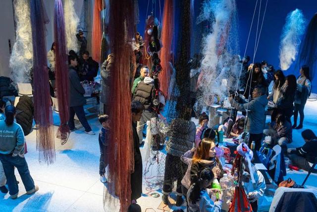 2月1日,浦东美术馆B1空间化身“正在发生”的创作现场。来自上海多所学校的学生与卡罗莱娜共同完成装置作品“幽灵网”的创作,作品是“鲸鱼的致敬”的衍生装置,以废弃渔网为主要材料。渔网由环保组织“野生动物救援”提供,参与学生则由环保组织“根与芽”从上海多所学校邀请。