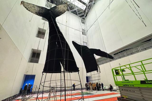 “鲸鱼的致敬”展览正在搭建中。赖鑫琳摄