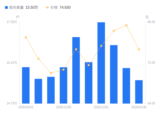 日期A股户数(户)流通A股户均持股数(股)户均持股市值(万元)2026-01-3015503215471.43115.462026-01-2015920315066.09119.592026-01-0916710814353.03112.382025-12-3117495513709.28103.272025-12-1916123814711.25105.262025-12-1016986013964.51104.302025-11-2815946914874.44105.102025-11-2015617615188.07106.302025-11-1015548315255.76111.082025-10-3115951414870.24114.52